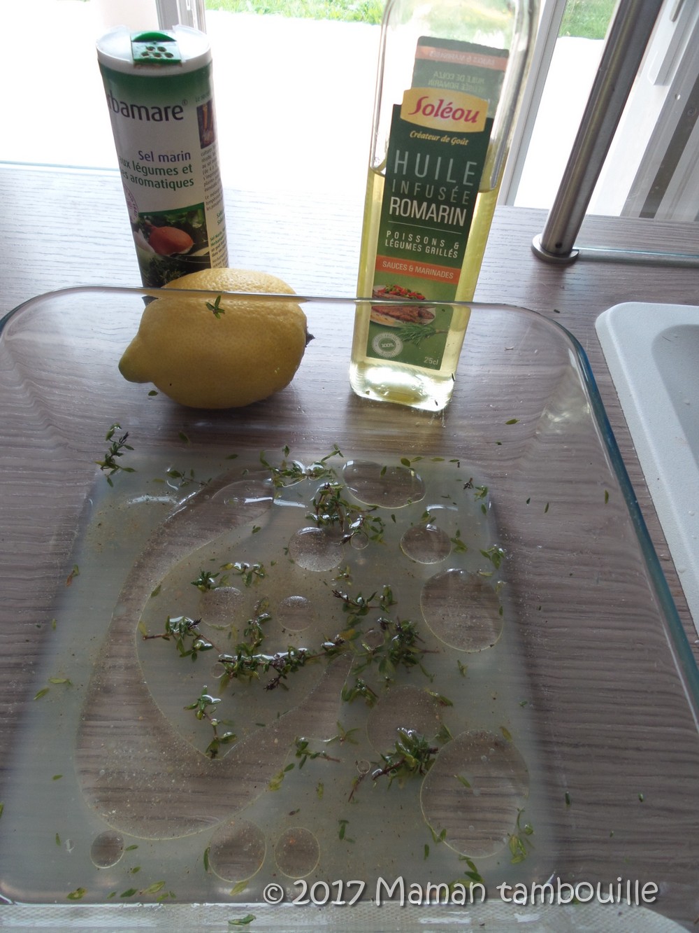 Dans un plat, verser le jus de 2 citrons. Ajouter l’huile, du sel et effeuiller le thym. Bien mĂ©langer.