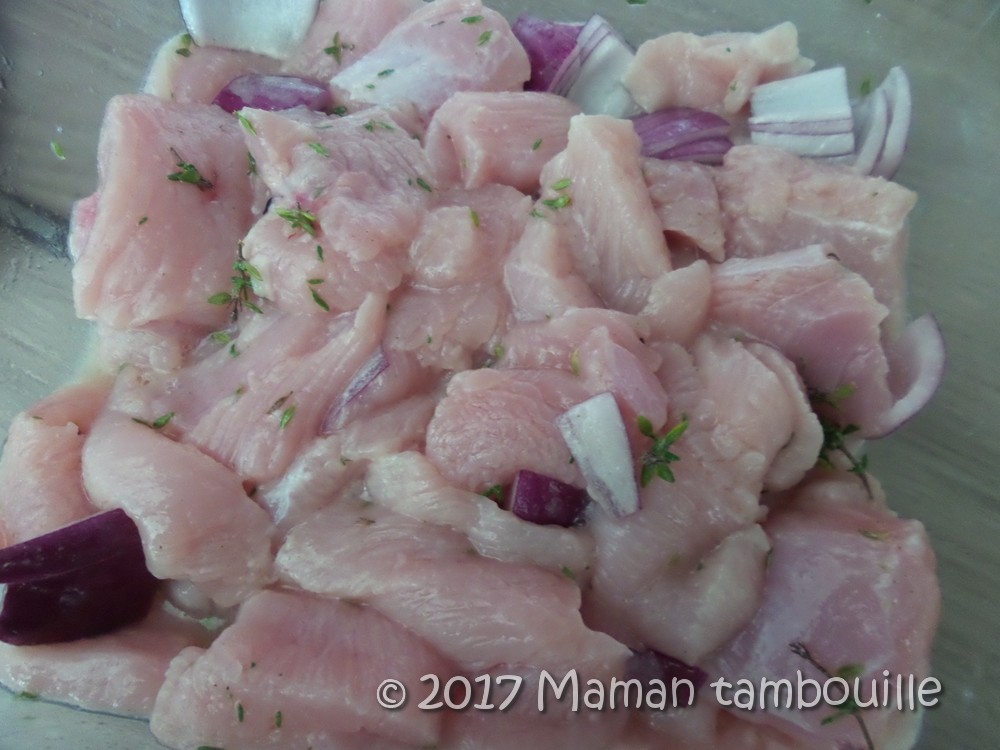 Bien mĂ©langer le tout et ajouter l’oignon rouge coupĂ© en gros morceaux. Laisser mariner au frais une nuit (ou au minimum 2h).