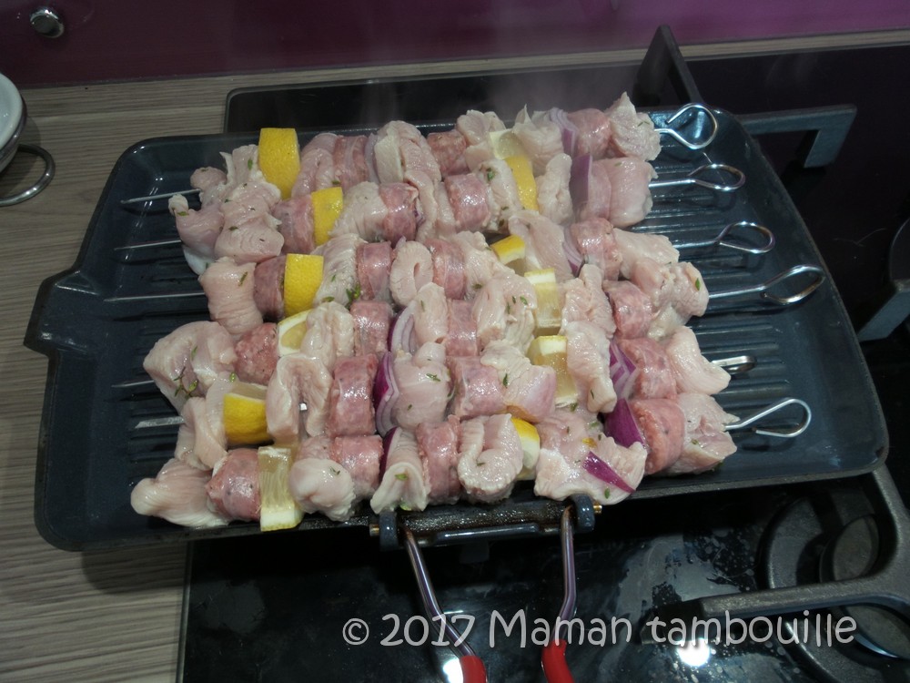Et voilĂ , j’ai intercalĂ© des morceaux de saucisses aux herbes entre mes morceaux de dinde marinĂ©e. On passe le tout au grill (ou au barbecue) et le tour est jouĂ©, de dĂ©licieuses brochettes que les enfants ont dĂ©vorĂ©es. Enfin, je dis que le tour est jouĂ© mais ça n’a pas vraiment Ă©tĂ© le cas pour moi ! Au moment oĂč j’ai voulu cuire mes brochettes, j’ai sorti mon grill Ă©lectrique du placard, je l’ai dĂ©poussiĂ©rĂ© un peu car ça faisait plusieurs mois que je ne l’avais pas utilisĂ© (pour ĂȘtre honnĂȘte, je trouve que c’est toujours la galĂšre pour nettoyer les plaques alors je ne l’utilise pas souvent) et hop, on branche et on laisse chauffer. Et puis, au bout de 2 min, mon grand me demande « y’a une coupure d’Ă©lectricitĂ© ? », « bah non pourquoi » je lui rĂ©ponds, « j’Ă©tais sur une partie sur la console et tout c’est coupĂ©, y’a plus de tĂ©lĂ© non plus ! ». Ah la la, galĂšre, c’est encore la pompe extĂ©rieure qui a tout fait sauter ! Je vais couper le disjoncteur impactĂ©, comme souvent, et je rĂ©-enclenche le jus … et paf ça ressaute ! Et puis je pense au grill qui est en chauffe, je le dĂ©branche, rĂ©-enclenche les disjoncteurs et plus de problĂšmes ! Snif, mon grill est HS, c’est bien malin, j’en fais quoi de mes brochettes !?! Et puis je me suis souvenue, qu’il a fort fort longtemps, j’avais une plaque Ă  grillade pour mettre sur le gaz. Je ne m’en servais plus et je l’avais mise au grenier pour la vendre au bric Ă  brac (bon, j’avoue, je trouvais aussi que c’Ă©tait galĂšre Ă  nettoyer). Un tour dans le grenier, on fouille dans les cartons et je retrouve ma plaque. Finalement, j’ai cuit mes brochettes sur cette plaque et j’ai trouvĂ© ça top, elle a retrouvĂ© sa place dans ma cuisine !!! En plus, j’ai rĂ©ussi Ă  la nettoyer sans encombres en versant un verre d’eau bouillante dans le fond juste aprĂšs ma cuisson, quand la plaque est encore chaude, c’est nickel, tout s’est dĂ©collĂ© sans effort !