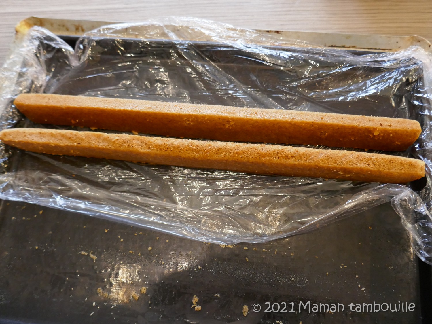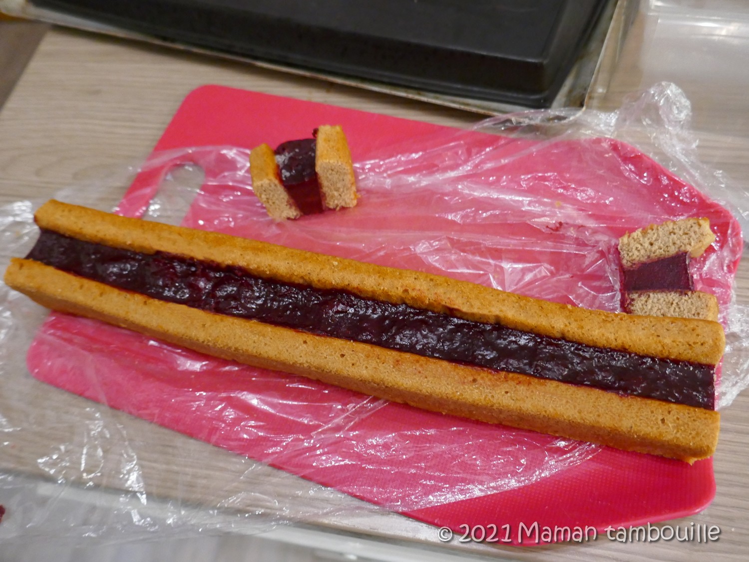 Couper le biscuit pain d’épices en 2 dans la longueur. Les poser debout sur un film alimentaire sur un plateau. Rabattre les bords du film sur les côtés et sur les bouts pour faire comme un moule.