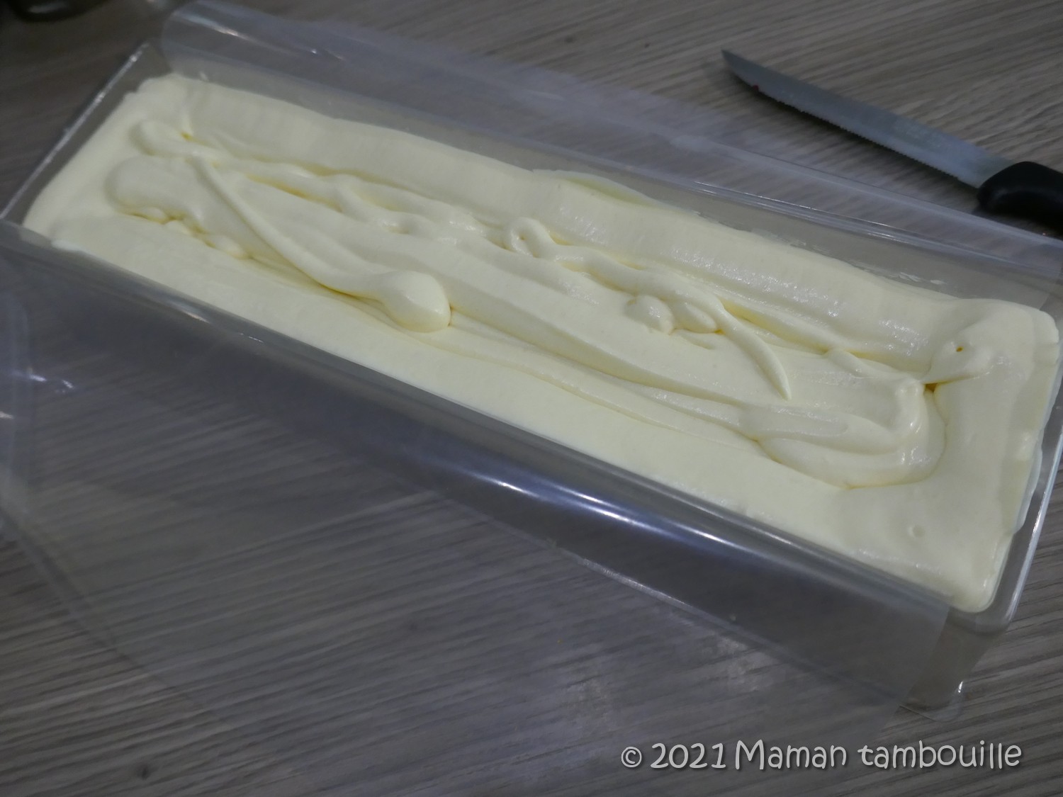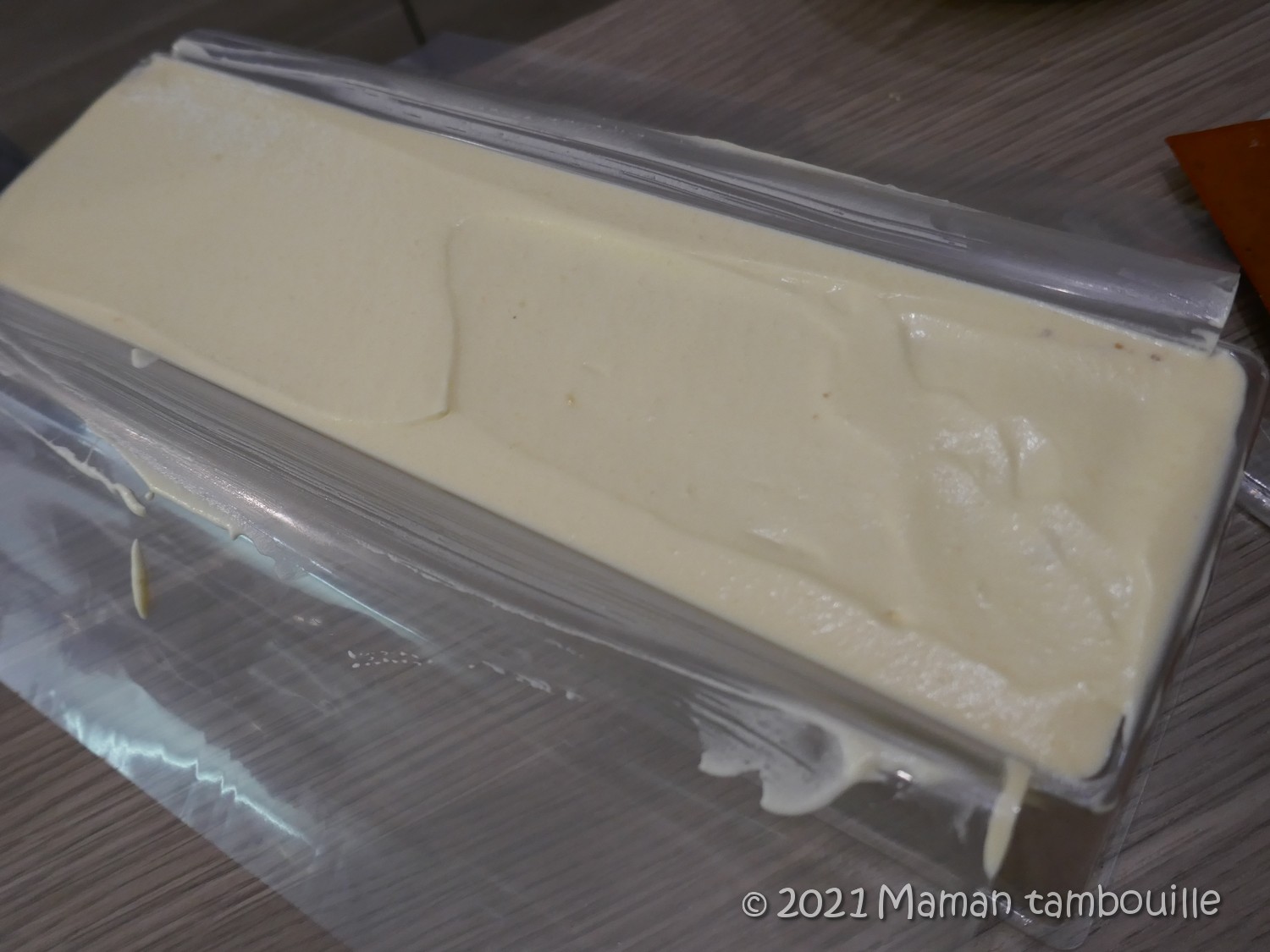 Préparer le moule à buche. Pour moi, un moule à buche en plastique dans lequel j’ai mis une feuille de papier guitare pour faciliter le démoulage.