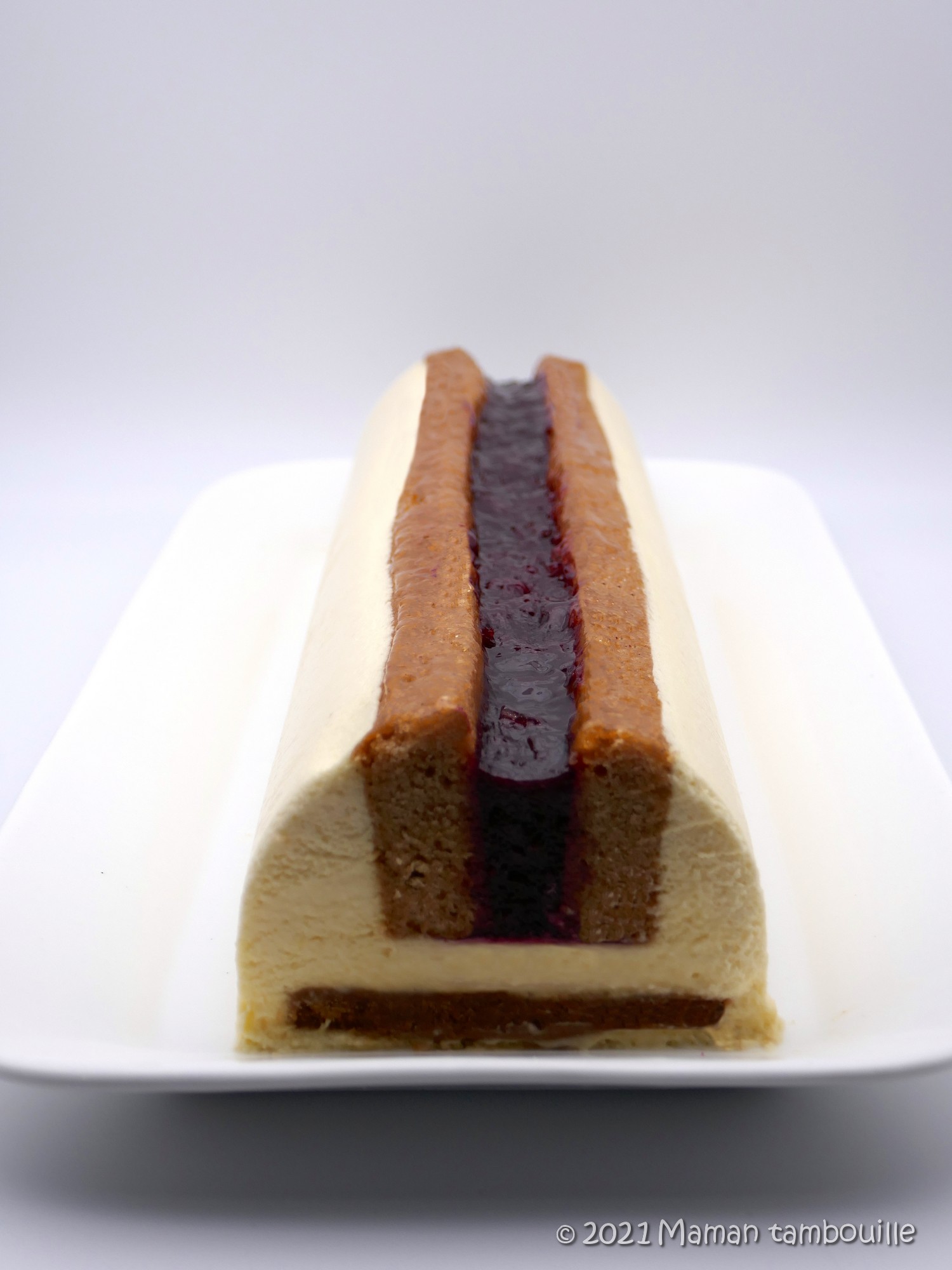 Et voilà donc le résultat. Ca donne une jolie bûche avec un style qui change un peu. Je n’ai pas rajouté de glaçage miroir sur la mousse. Du coup, c’est moins brillant mais ça a l’avantage de ne pas rajouter de sucre. J’ai juste passé au pinceau un peu de nappage abricot sur le dessus du pain d’épice et l’insert cerise. Cette bûche est très légère et pas trop sucrée. On l’a bien appréciée et il ne fait aucun doute sur le fait que je la referai.