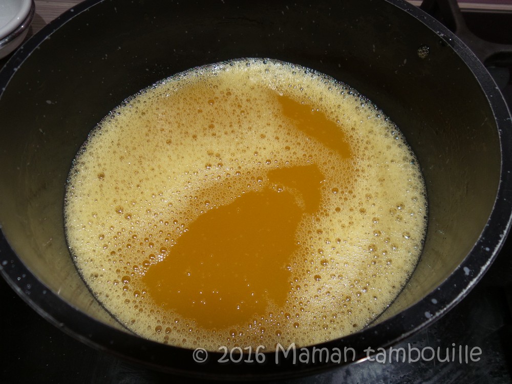 Chauffer. Quand c’est chaud, couper le feu puis ajouter la gélatine bien essorée entre les mains. Bien mélanger pour dissoudre la gélatine.