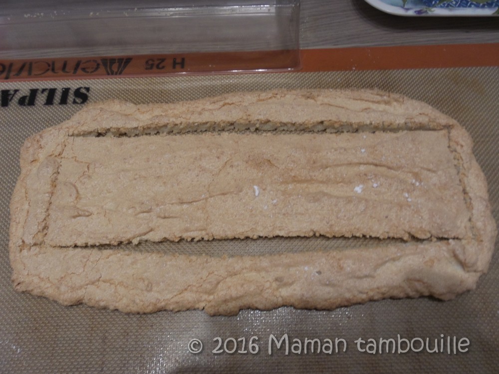 Poser le moule à bûche à l’envers et couper la dacquoise à la taille du moule.