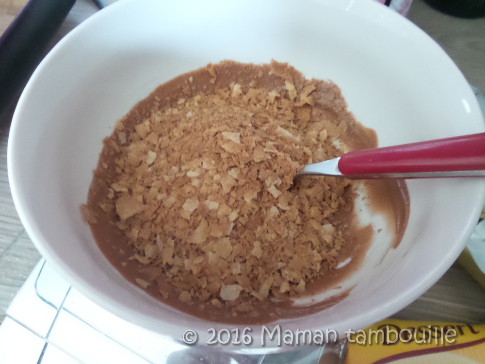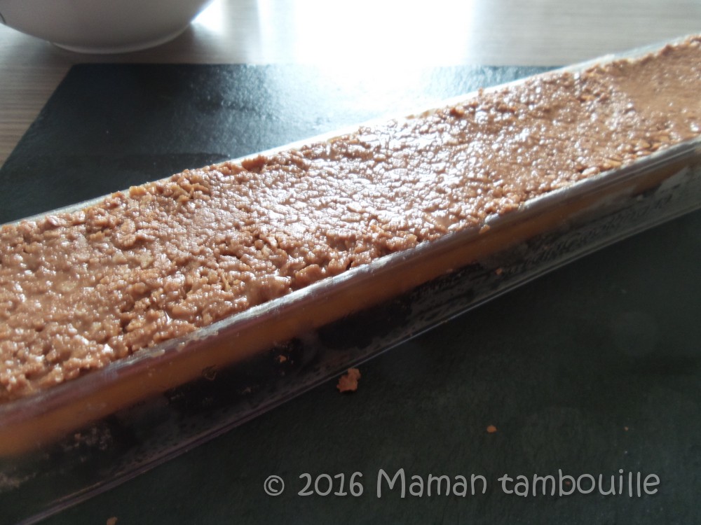 Etaler la feuillantine sur l’insert passion congelé et tasser avec le dos d’une cuillère. Remettre au congélateur.