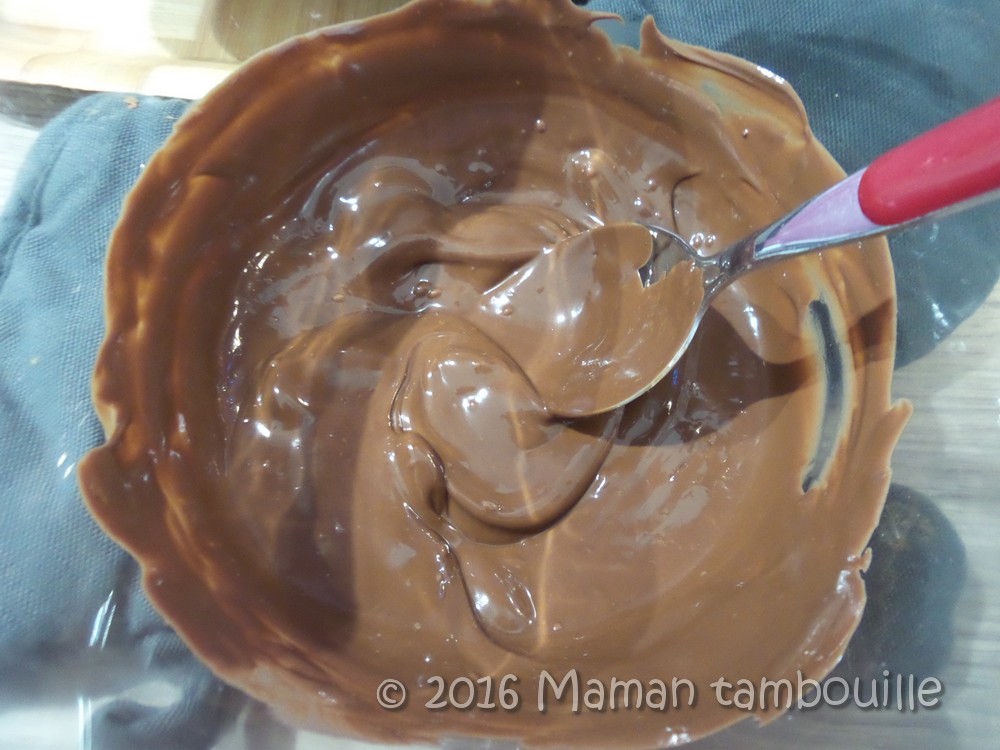Le jour J (matin pour un service le soir ou alors la veille au soir pour un service le lendemain midi), réchauffer le glaçage au bain marie ou au micro ondes en y allant doucement. Il suffit juste de faire fondre le chocolat, le mélange ne doit pas trop chauffer. Eviter de mélanger le glaçage pour ne pas former de bulles d’air. Quand le chocolat est fondu et liquide, mettre un thermomètre de cuisine dedans et laisser descendre la température à 33°.