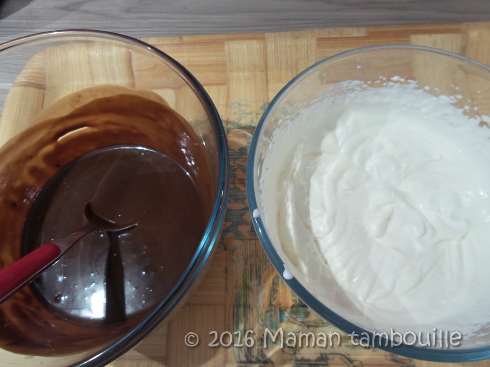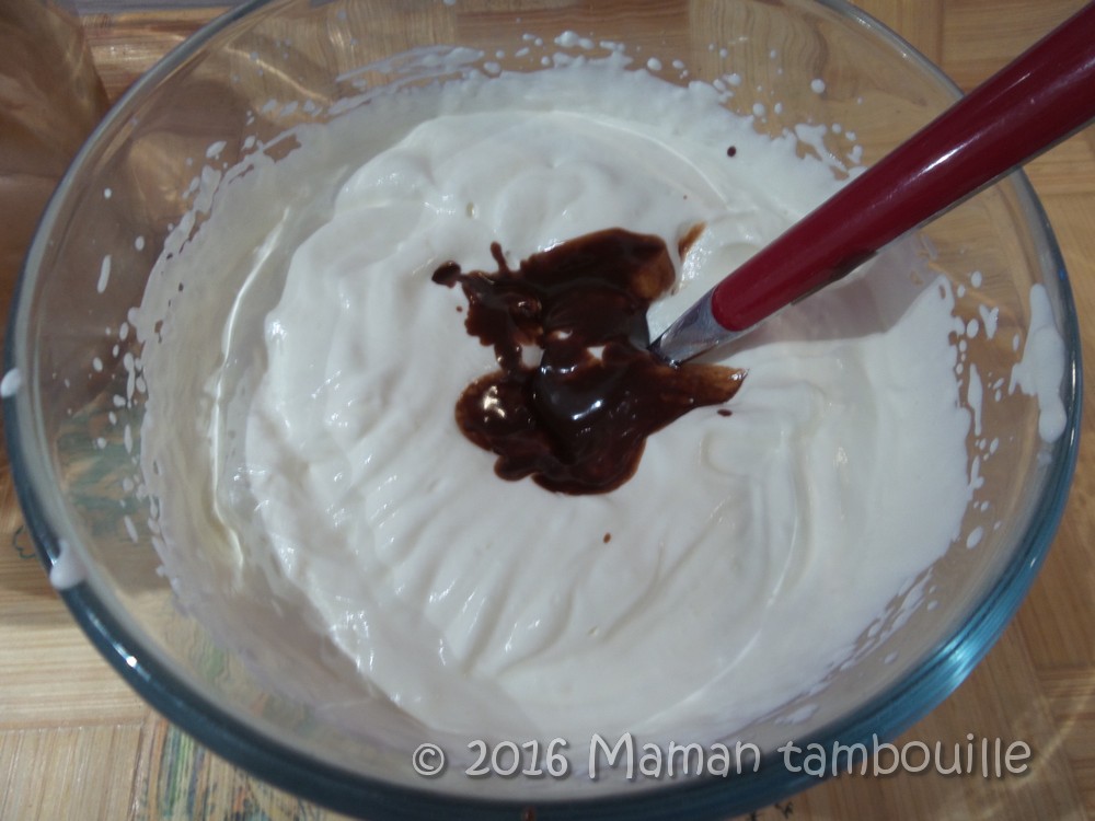 Verser le chocolat bien tiédi (presque froid) dans la crème.