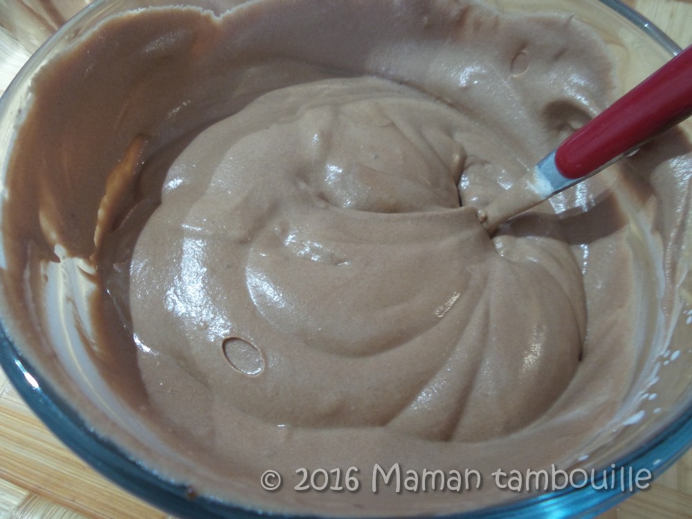 Verser la crème sur le chocolat en 3 fois et bien mélanger à la maryse.