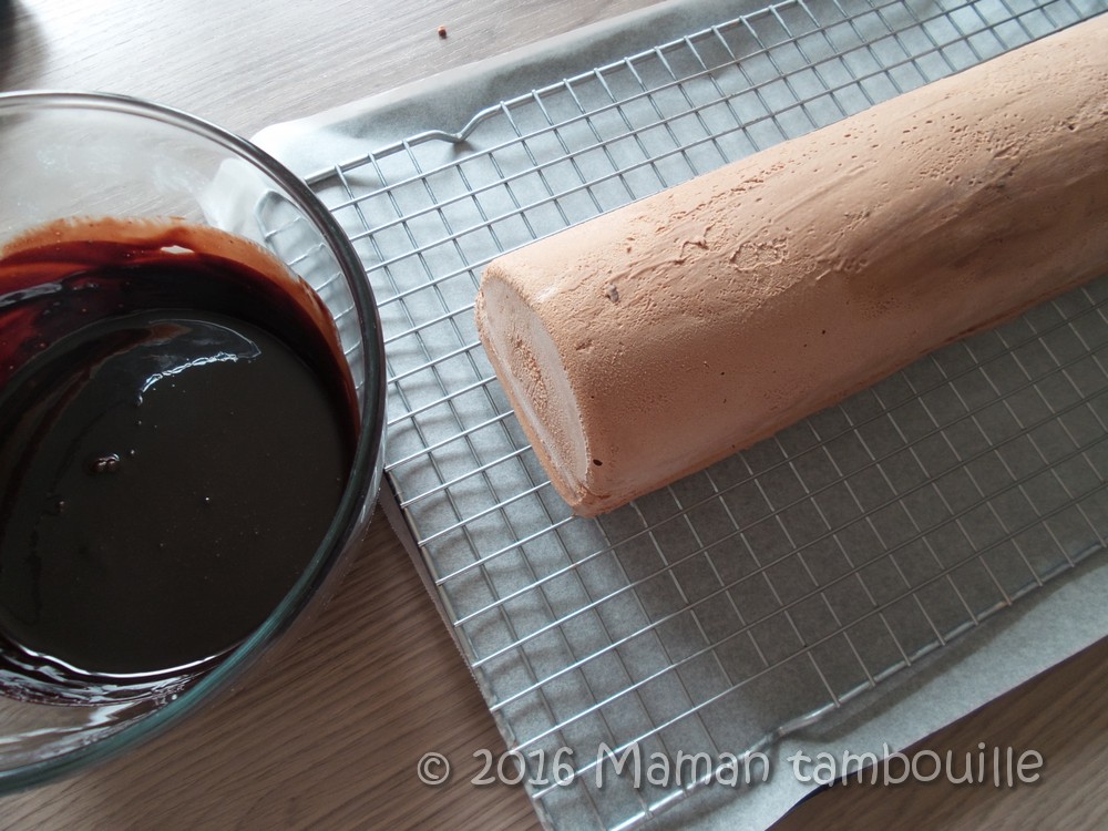 Sortir la bûche du congélateur. La démouler (un filet d’eau chaude sur le dos du moule) et la poser congelée sur une grille poser au dessus d’un plat.