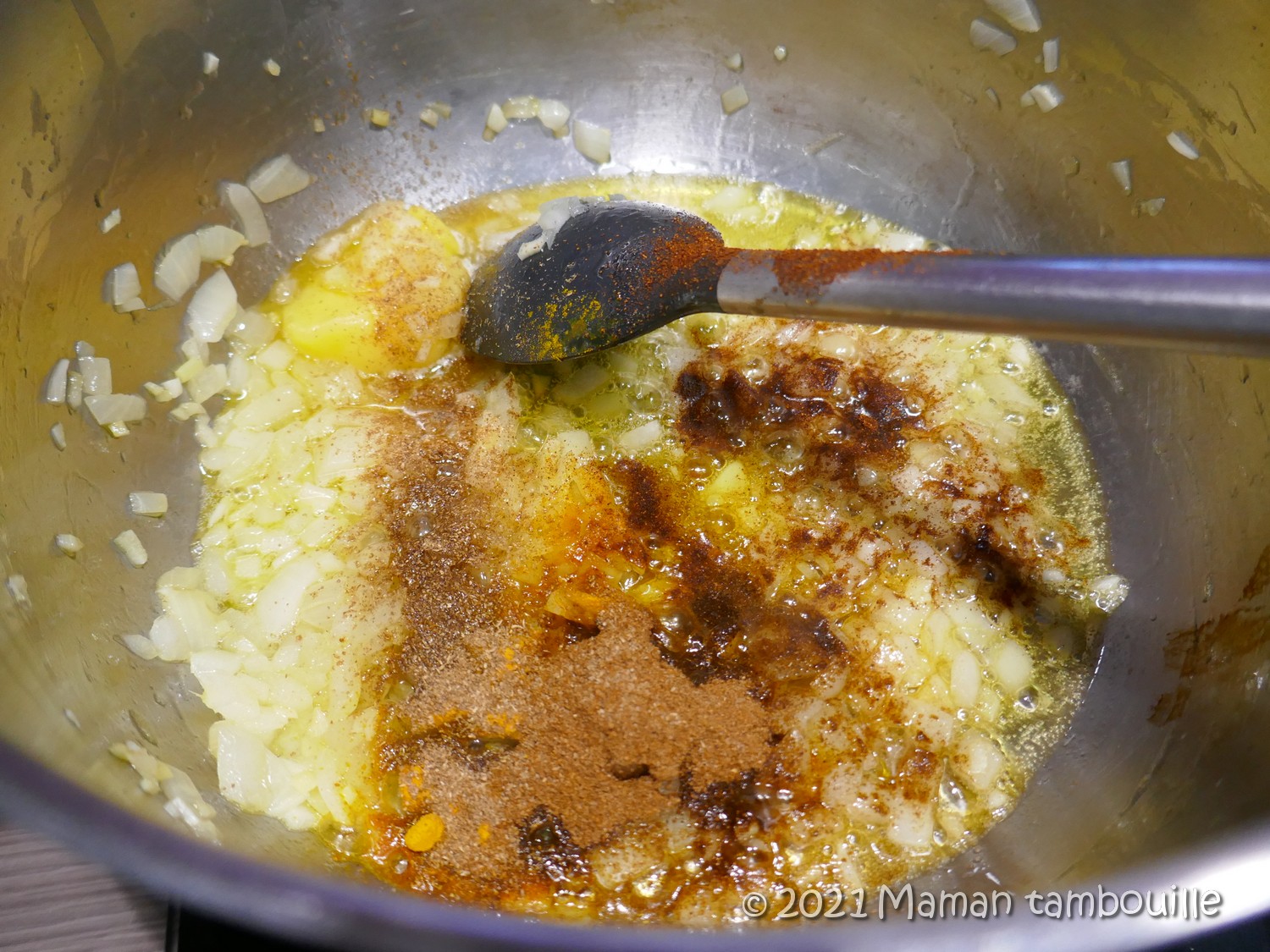 Ajouter toutes les épices et la cassonade. Chauffer 2 min en mélangent.