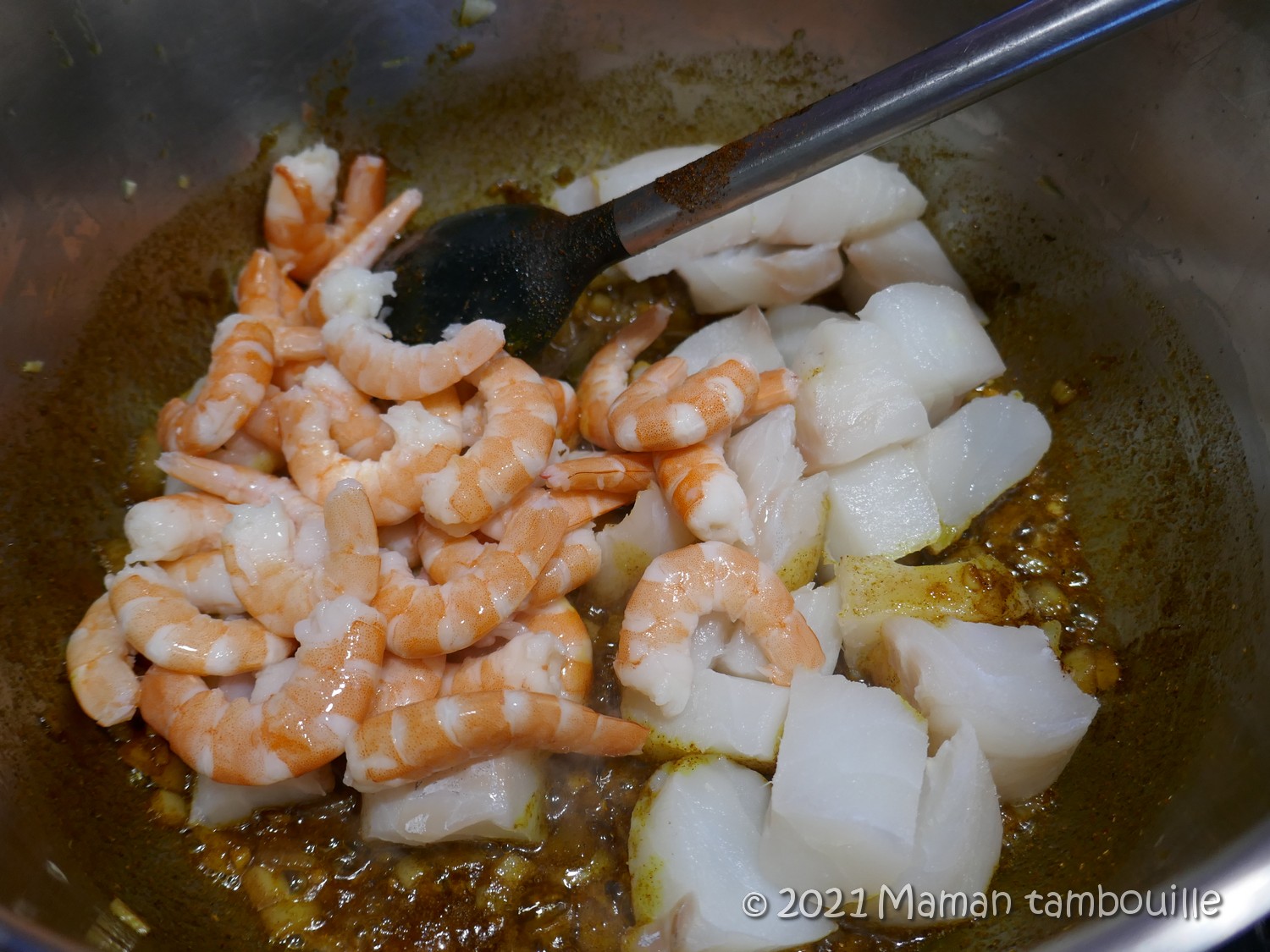 Ajouter les crevettes décortiquées et le poisson coupé en gros cubes.