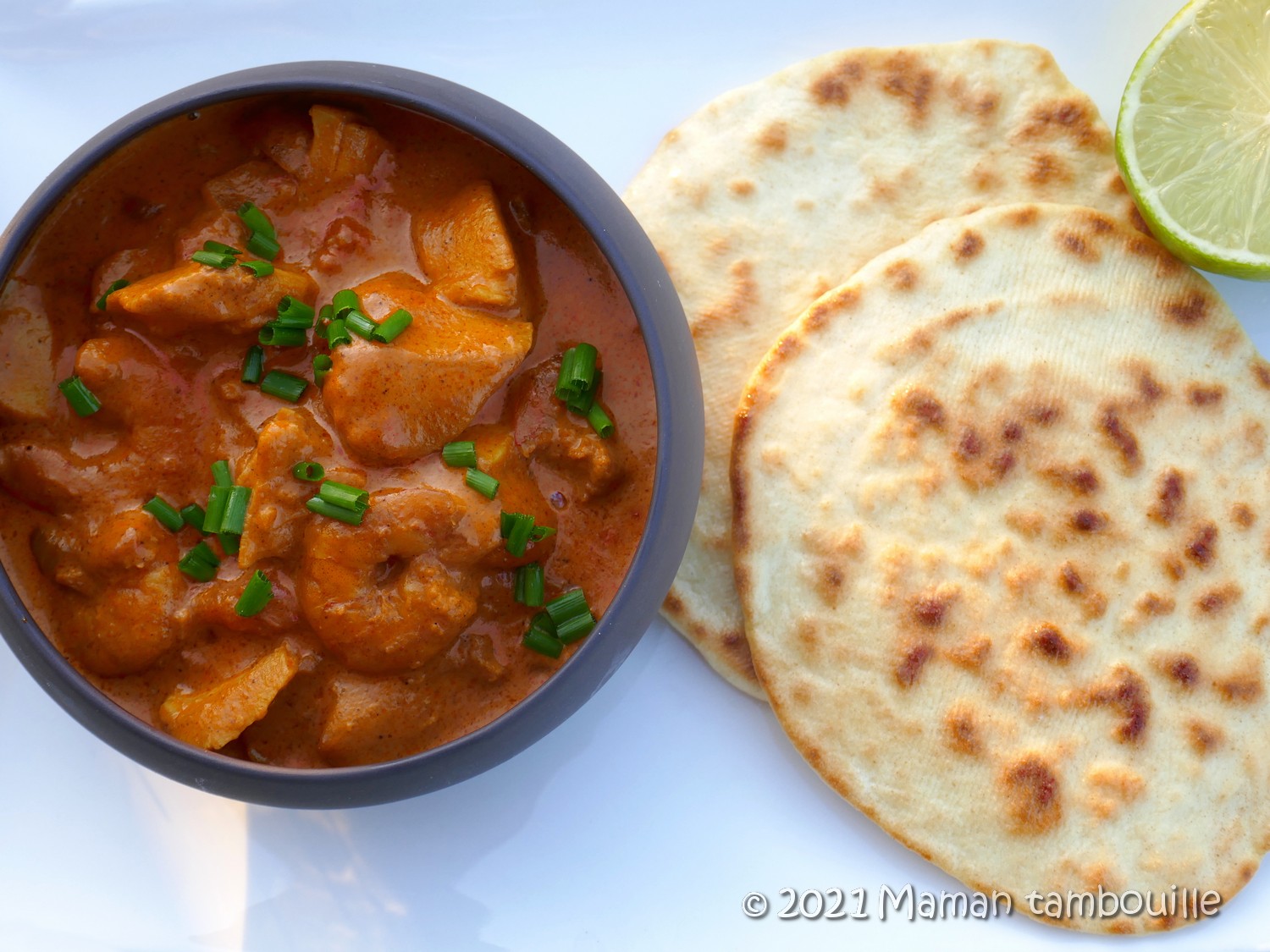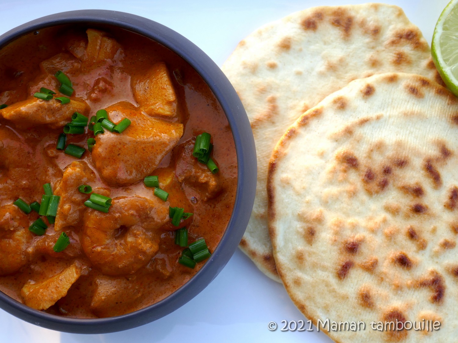 Humm, je suis trop fan de ce plat ! Il y a quelques semaines, j’avais fait un butter chicken (je dois d’ailleurs publier la recette). Je me suis dis que la recette pourrait convenir également pour du poisson et des crevettes. Quelle idée grandiose 😉 Voilà un plat trop trop bon comme je les aime. Il est puissant en épices, de quoi donner un petit coup de chaleur sans le côté piquant. Une invitation au voyage ! Pour accompagner ce plat ? Des naans express bien sûr !