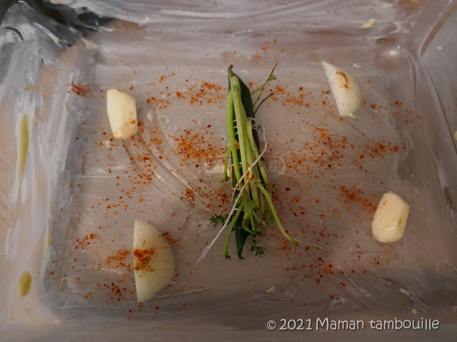 Ajouter au milieu le bouquet garni (laurier, thym, les tiges de basilic, une tige de persil).