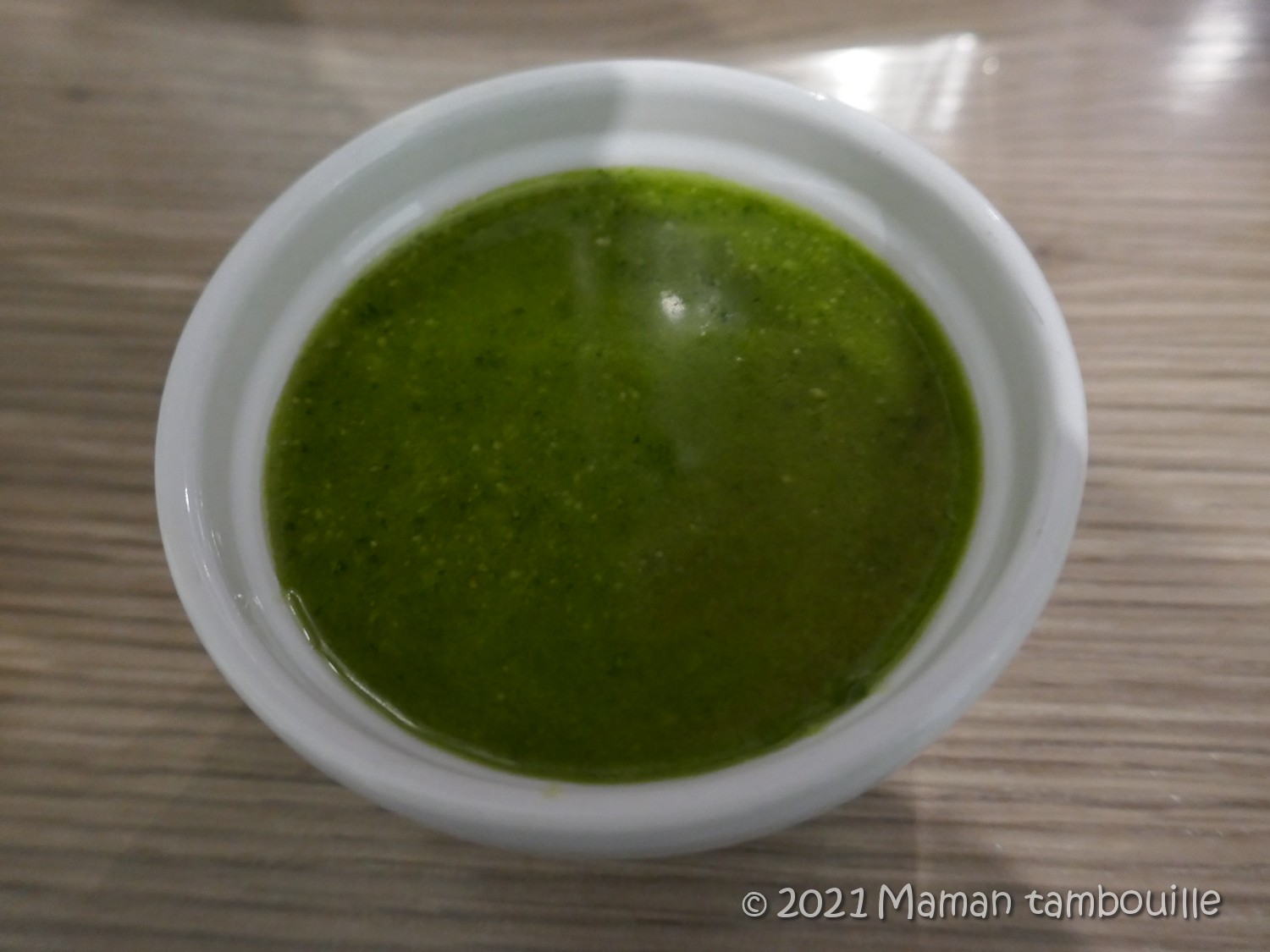 Mixer ensemble les feuilles de basilic, les pignons et du sel. Ajouter ensuite l’huile d’olive et mixer à nouveau. Réserver au frais.