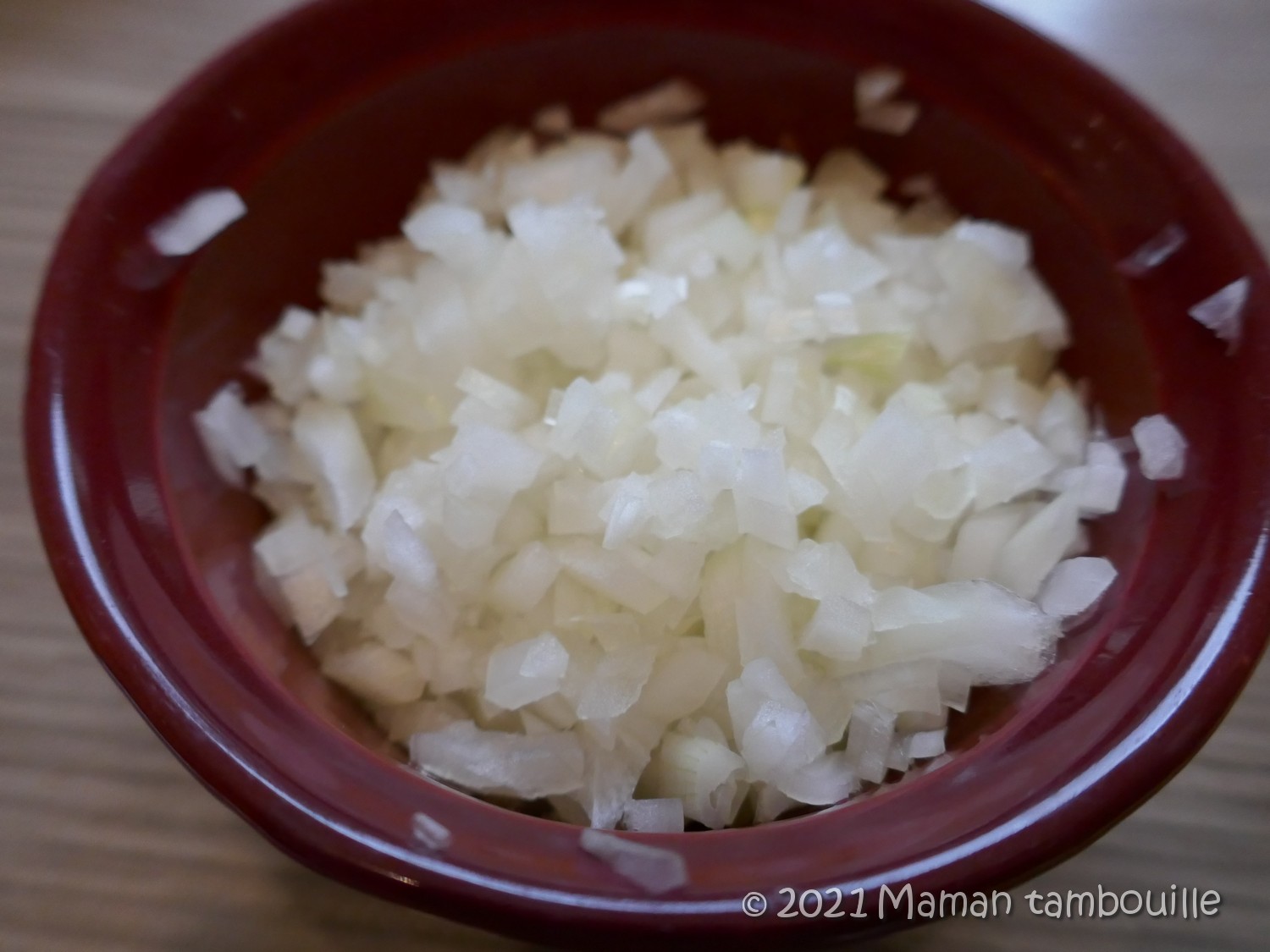 Ciseler l’oignon finement. Note: garder le pied pour la suite.