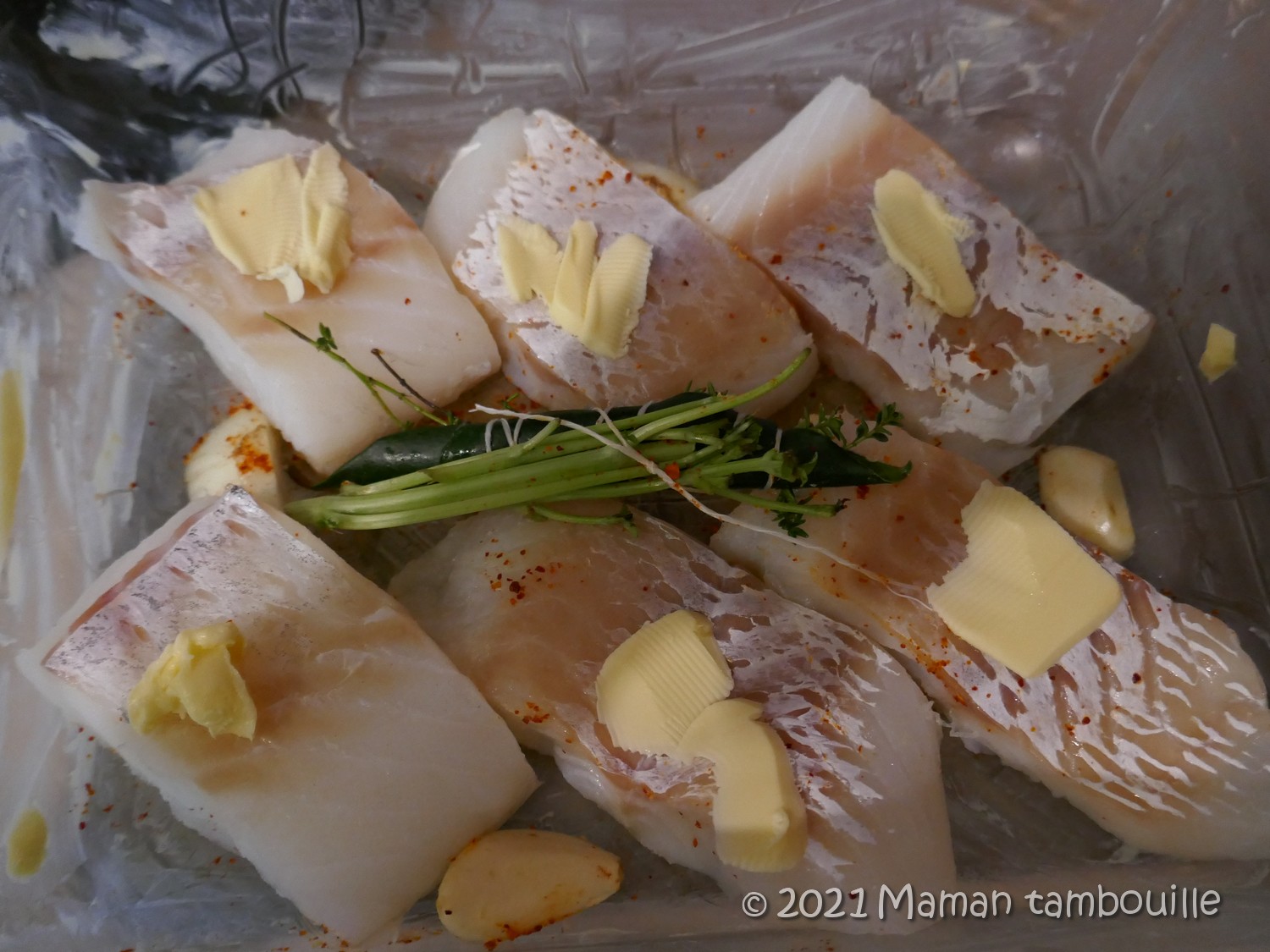Disposer les dos de poisson. Déposer une noisette de beurre sur chaque filet.