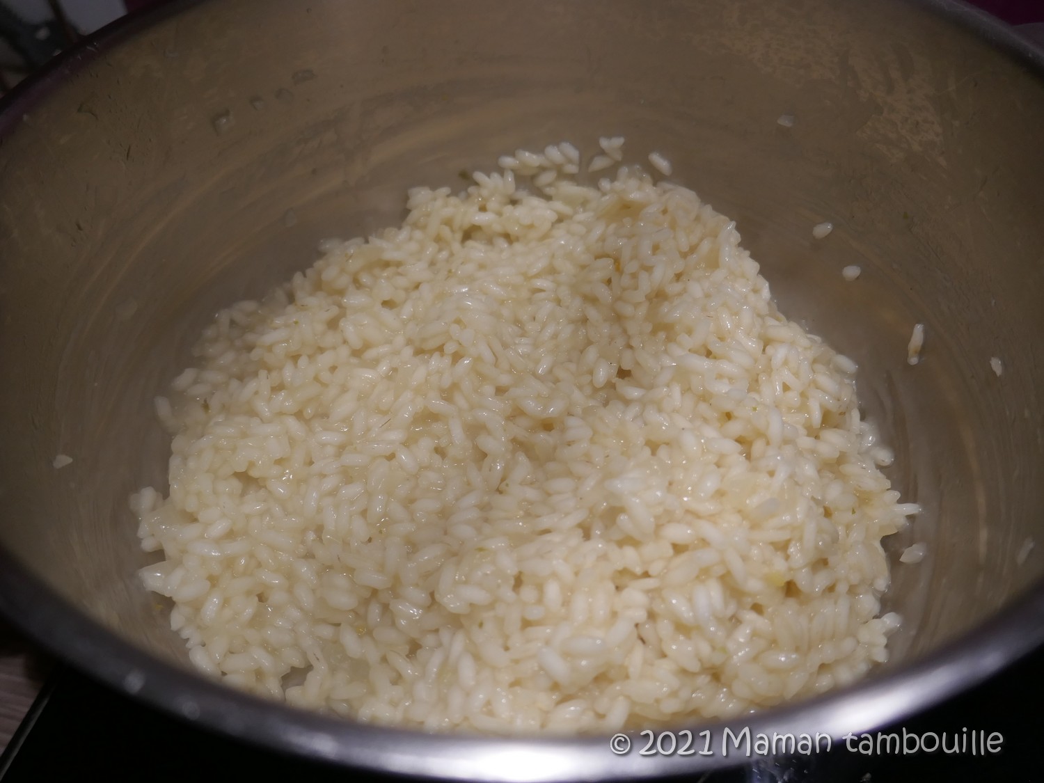 On peut le préparer en 2 fois pour s’avancer: on le cuit au 2/3 avec 2 volumes de bouillon. On le réserve jusqu’au service. Pour finir, on termine la cuisson avec le 1/3 restant de bouillon.