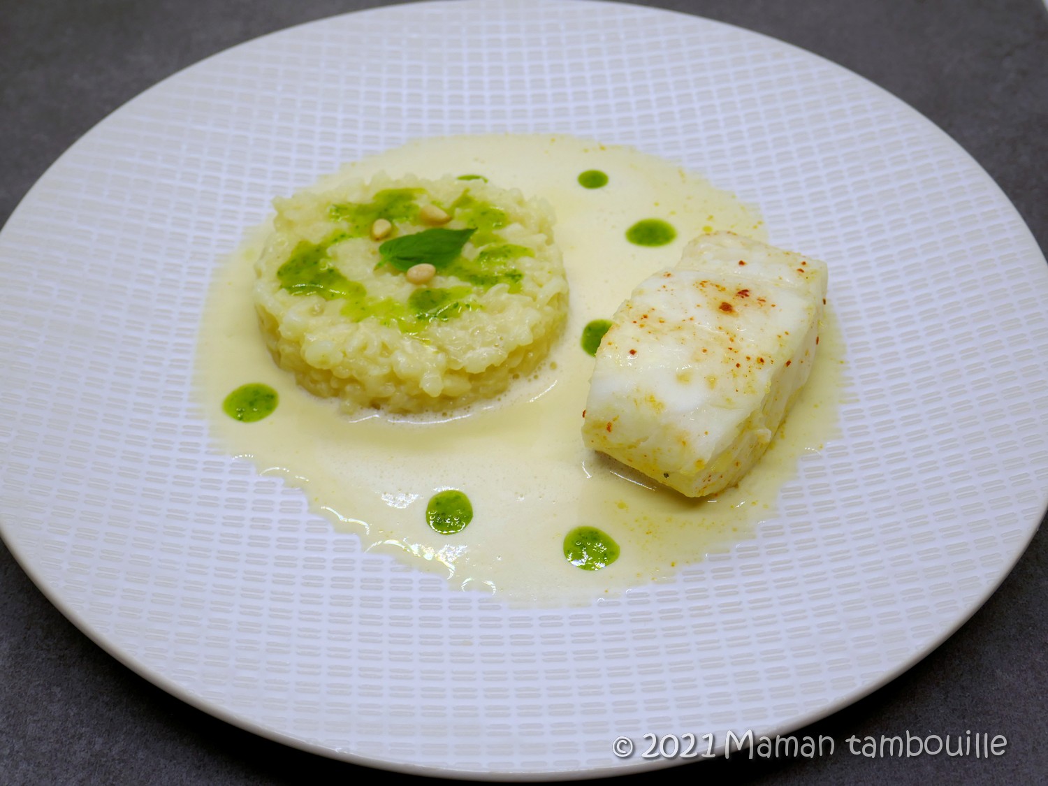 Une recette de poisson digne d’un plat de restaurant. Normalement, elle est à réaliser avec des filets de sole mais, quand on habite en campagne et qu’on ne veut pas faire des dizaines de kilomètres pour faire les courses, on doit parfois se contenter de ce qu’on trouve. Donc, pour aujourd’hui, ce sera dos de cabillaud. Pour l’accompagnement, un risotto, un pistou et une sauce réalisée avec le jus de cuisson du poisson.