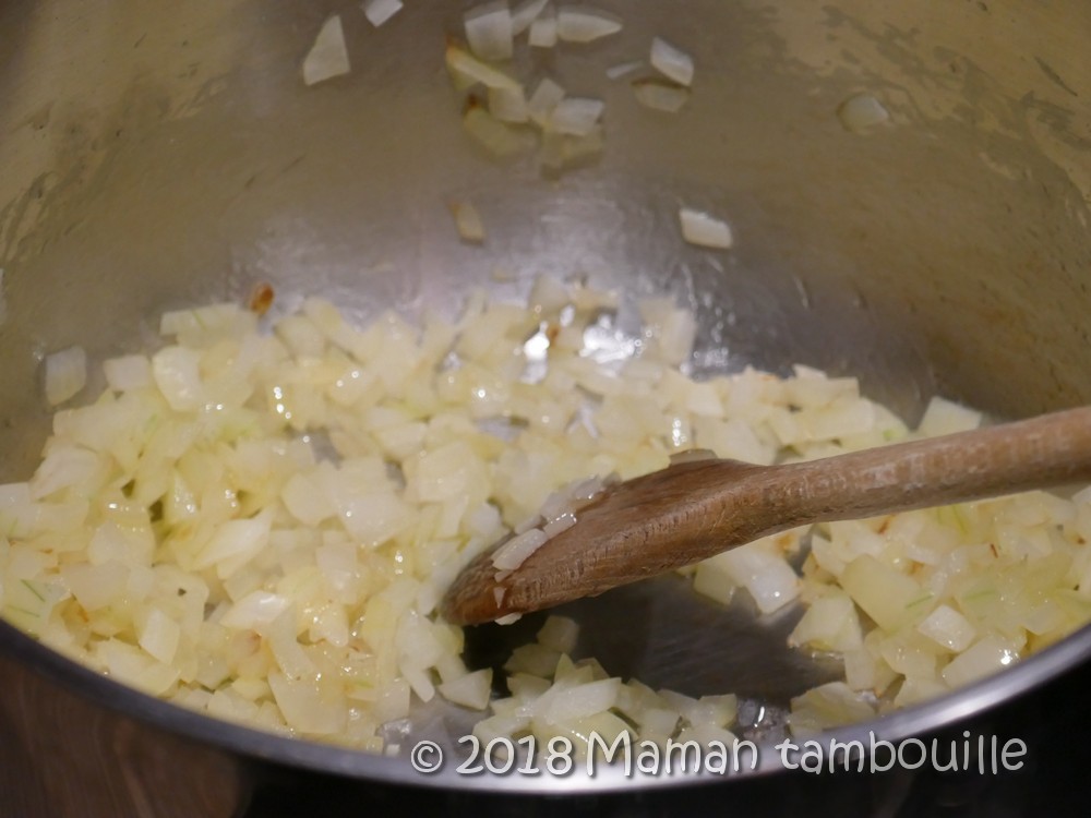 Dans une grande casserole, faire revenir un oignon émincé finement dans un peu d’huile d’olive.