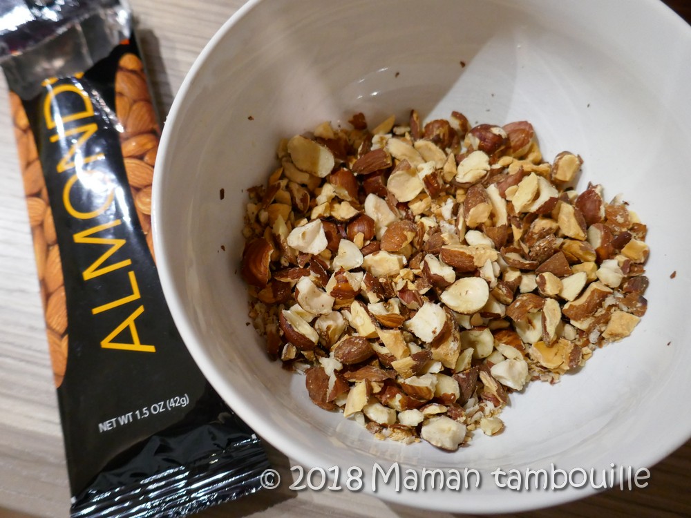 - 40g d’amandes grillées (amandes grillées et salées Wonderful pour moi)