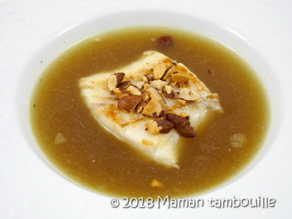 Pour servir, mettre 2 cuillères à soupe d’oignons confits dans le fond d’assiettes creuses. Déposer le dos de cabillaud. Couvrir d’une louche de bouillon puis déposer les noisettes et amandes sur le poisson. Servir aussitôt.