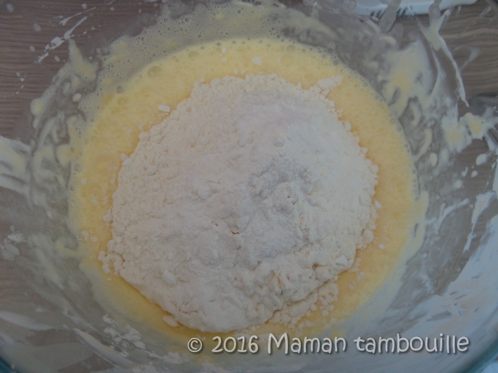 Ajouter la farine et la levure et fouetter.