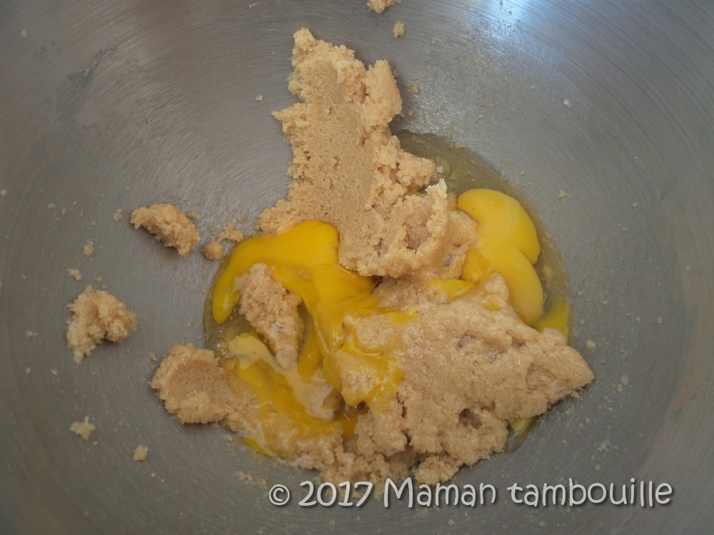 Dans le bol d’un robot pâtissier avec le fouet plat, mettre la cassonade et le beurre mou.