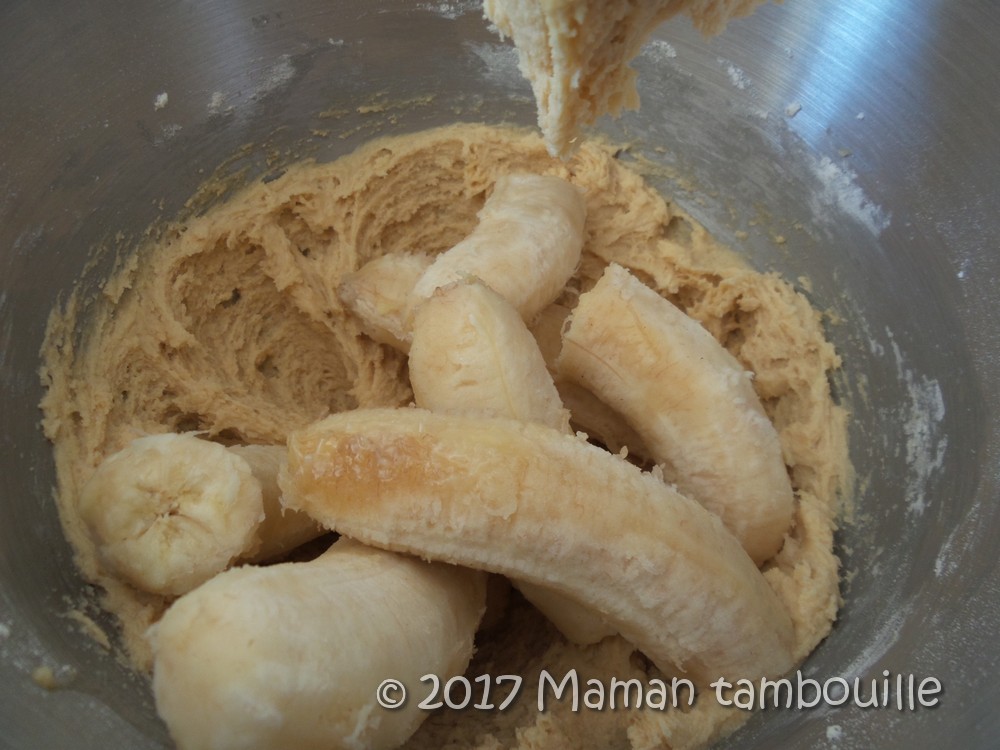 Ajouter les bananes (si elles ne s’écrasent pas facilement, les écraser à la fourchette avant de les mettre dans le saladier). Fouetter à nouveau.