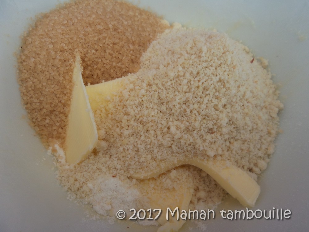 Dans un saladier, mettre la farine, la cassonade, la poudre d’amande et le beurre froid coupé en morceaux. Mélanger du bout des doigts pour avoir un mélange sableux.