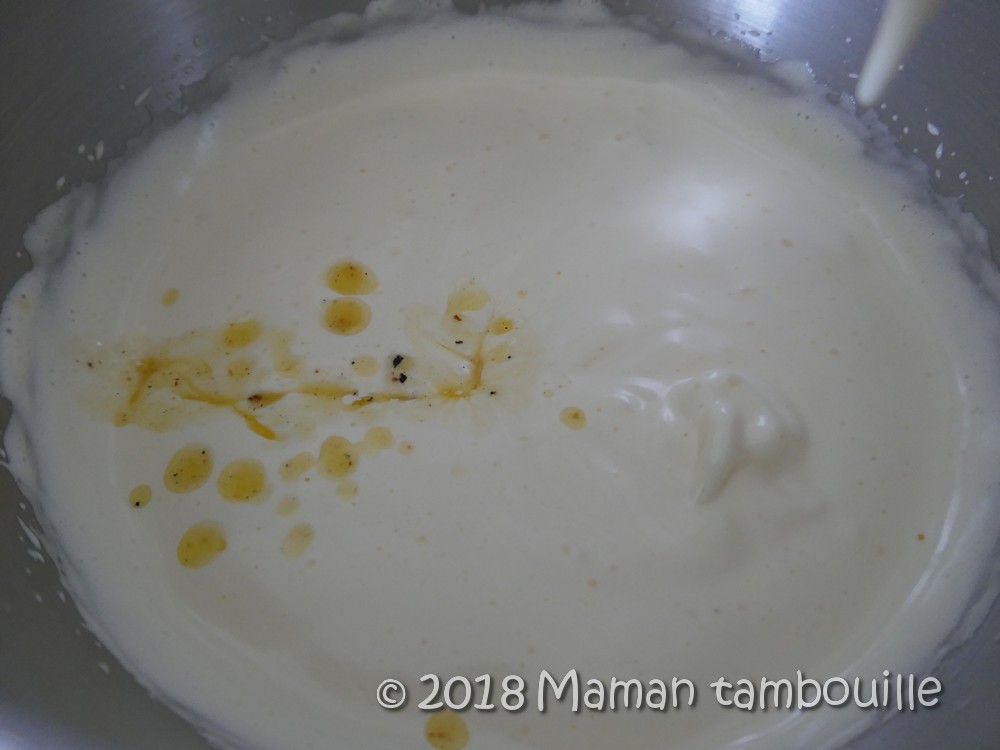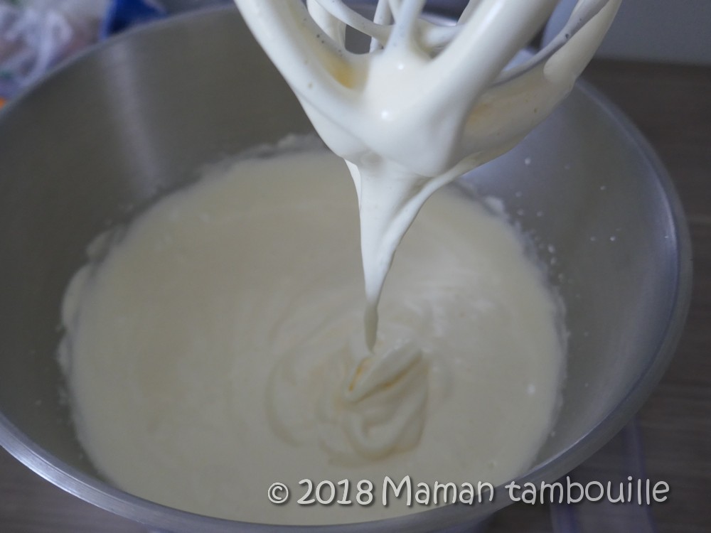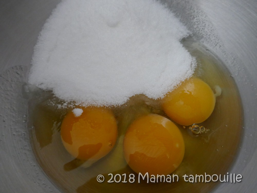 Dans le bol d’un robot pâtissier avec le fouet, casser les oeufs avec le sucre.