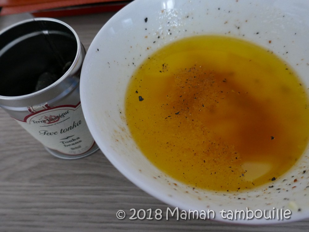 Dans un bol, faire fondre le beurre puis y râper la fève tonka.