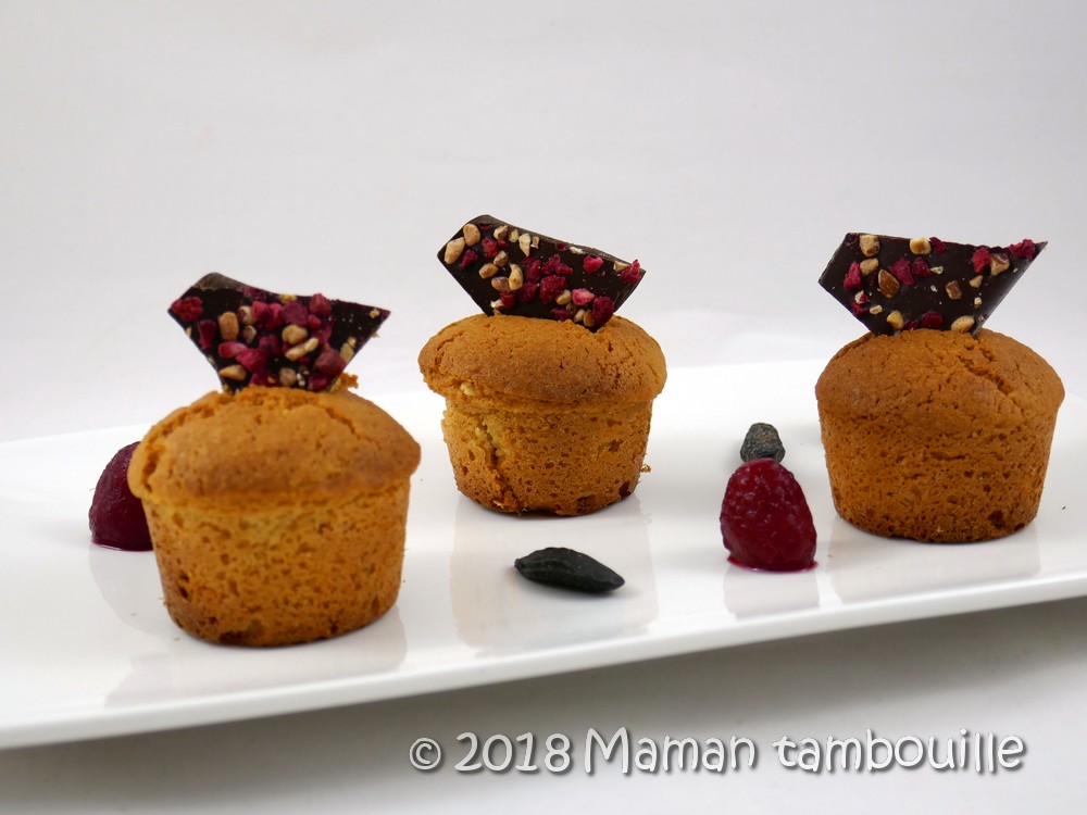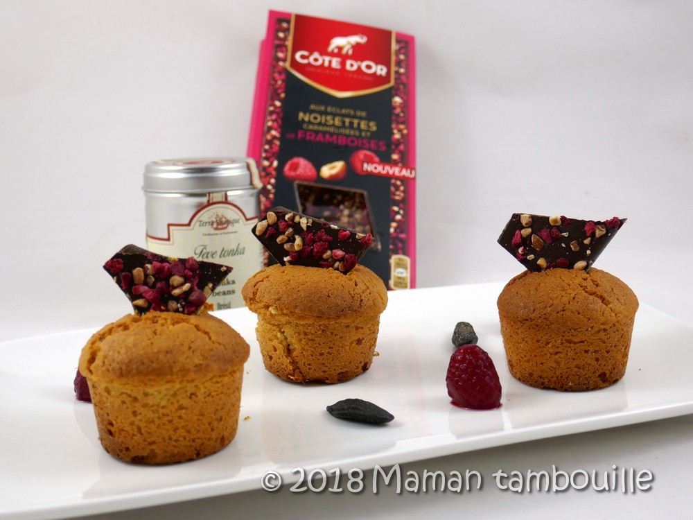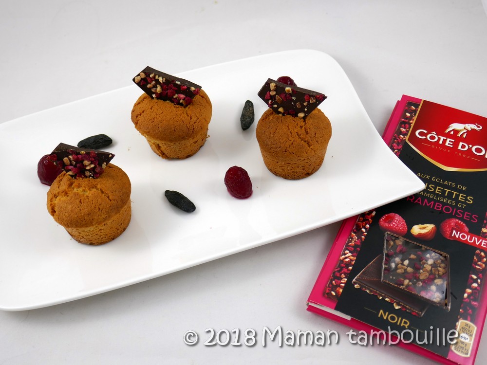 J’ai planté dans chaque cake un petit morceau de chocolat (Côte d’Or aux éclats de noisettes caramélisées et framboises reçu dans la dernière Degustabox).