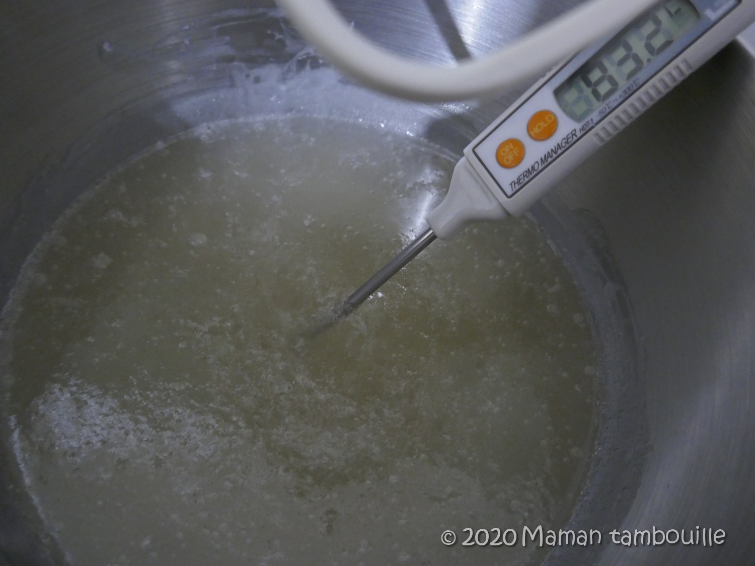 Porter à ébullition puis baisser pour passer à feu moyen. Laisser monter la température jusqu’à 116° (pas plus, pas moins !)
