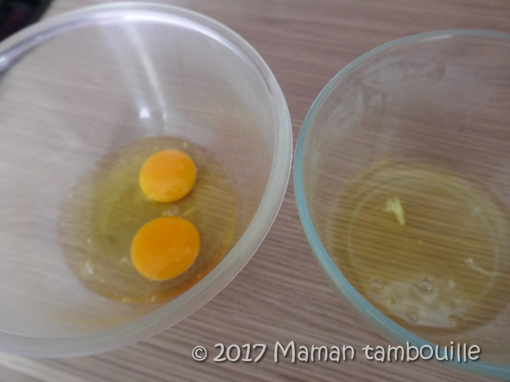 Dans un saladier, casser 2 œufs. Dans un 2ème saladier, mettre 2 blancs d’œufs.