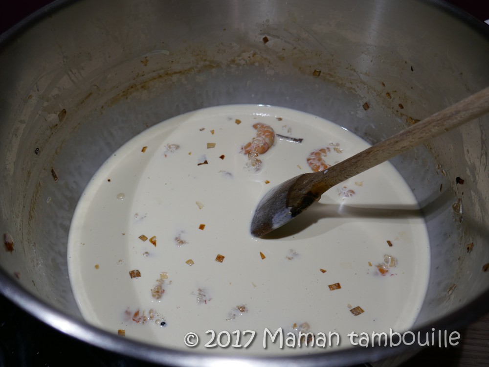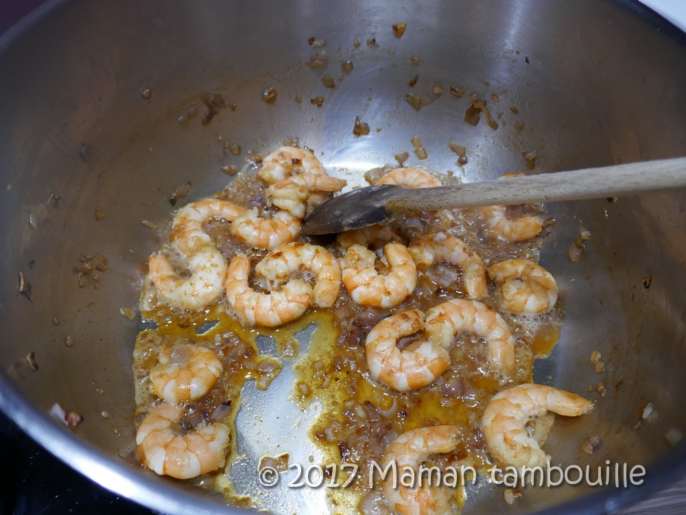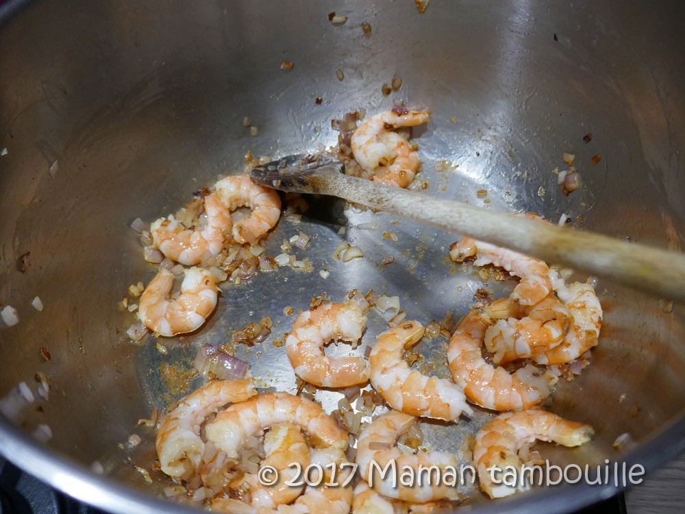 Décortiquer les crevettes et les ajouter aux échalotes.