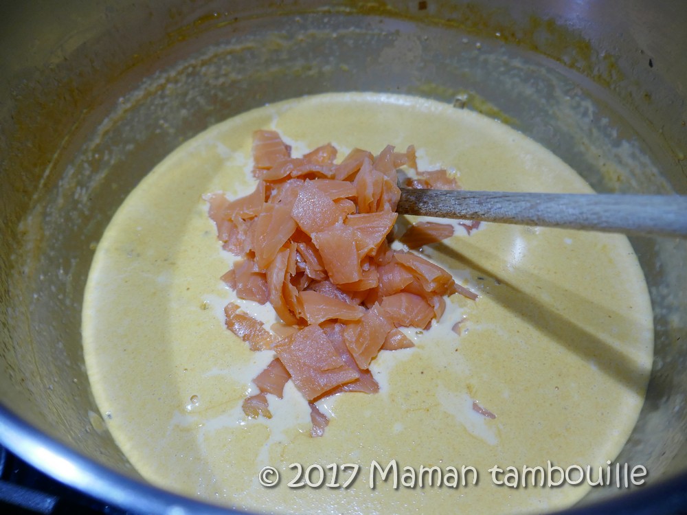 Ajouter le saumon fumé coupé en morceaux et mélanger. Laisser cuire 1 min.