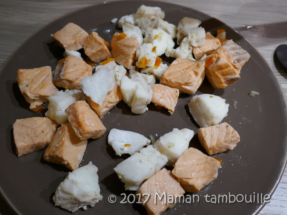 Mettre les cubes de saumon dans le court bouillon et laisser cuire 4 min. Ajouter les cubes de cabillaud et prolonger la cuisson de 3-4 min.