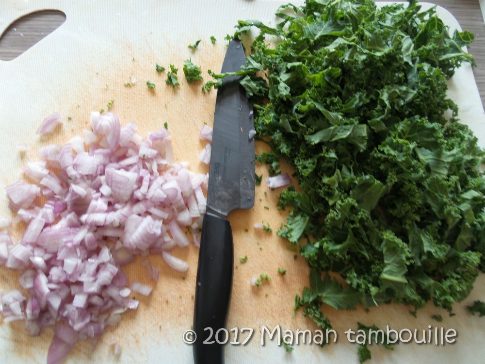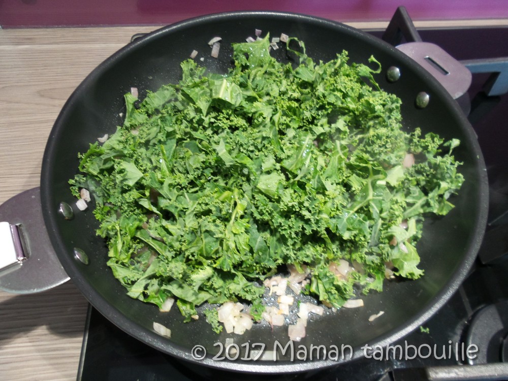 Quand les échalotes sont fondantes, ajouter le chou kale avec 1/2 verre d’eau. Laisser cuire 5 min.