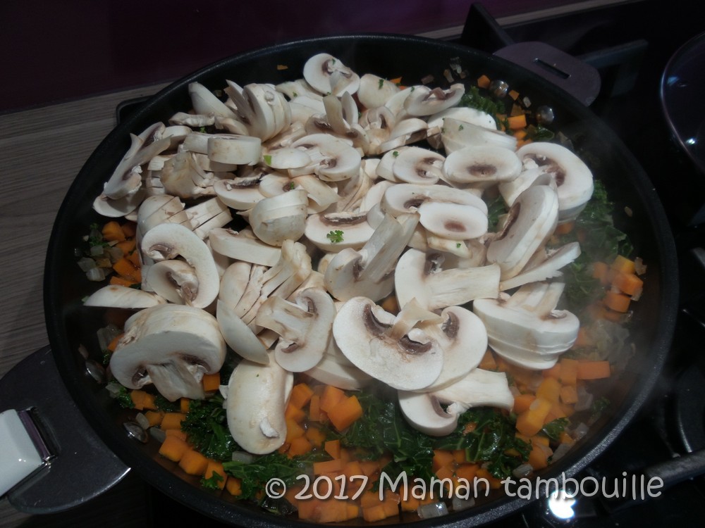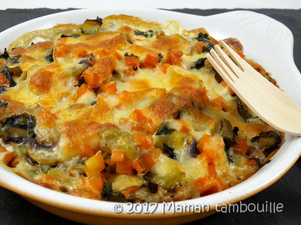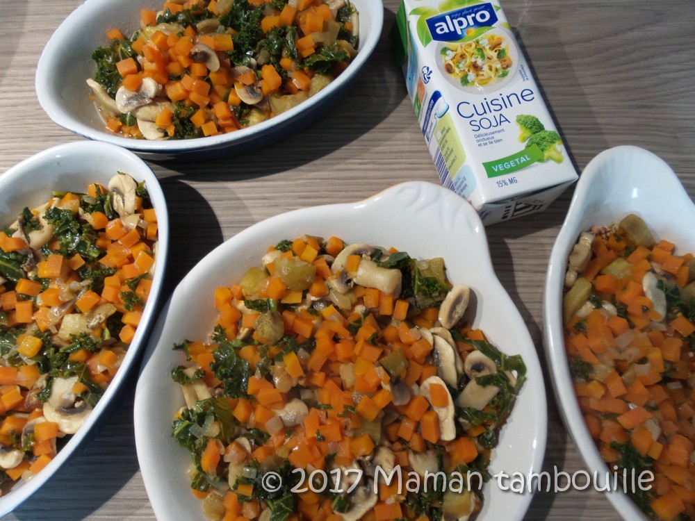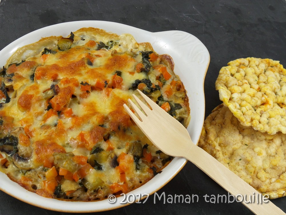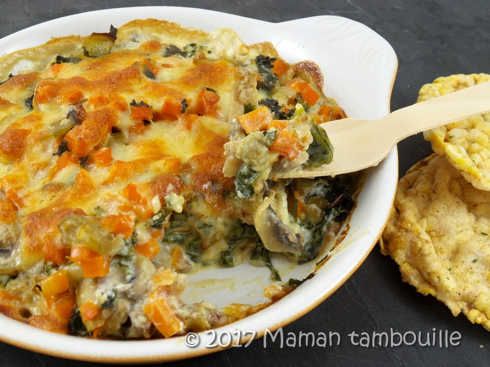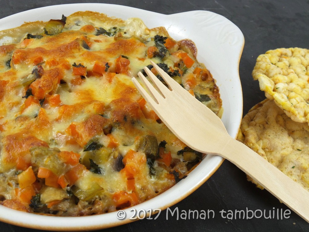 Vous y mettrez les légumes que vous voulez. Perso, il me restait des carottes et des champignons et j’avais dans mon jardin du chou kale et une aubergine. Associé au sarrasin grillé, c’est un petit gratin très agréable et sans viande, parfait pour le soir.