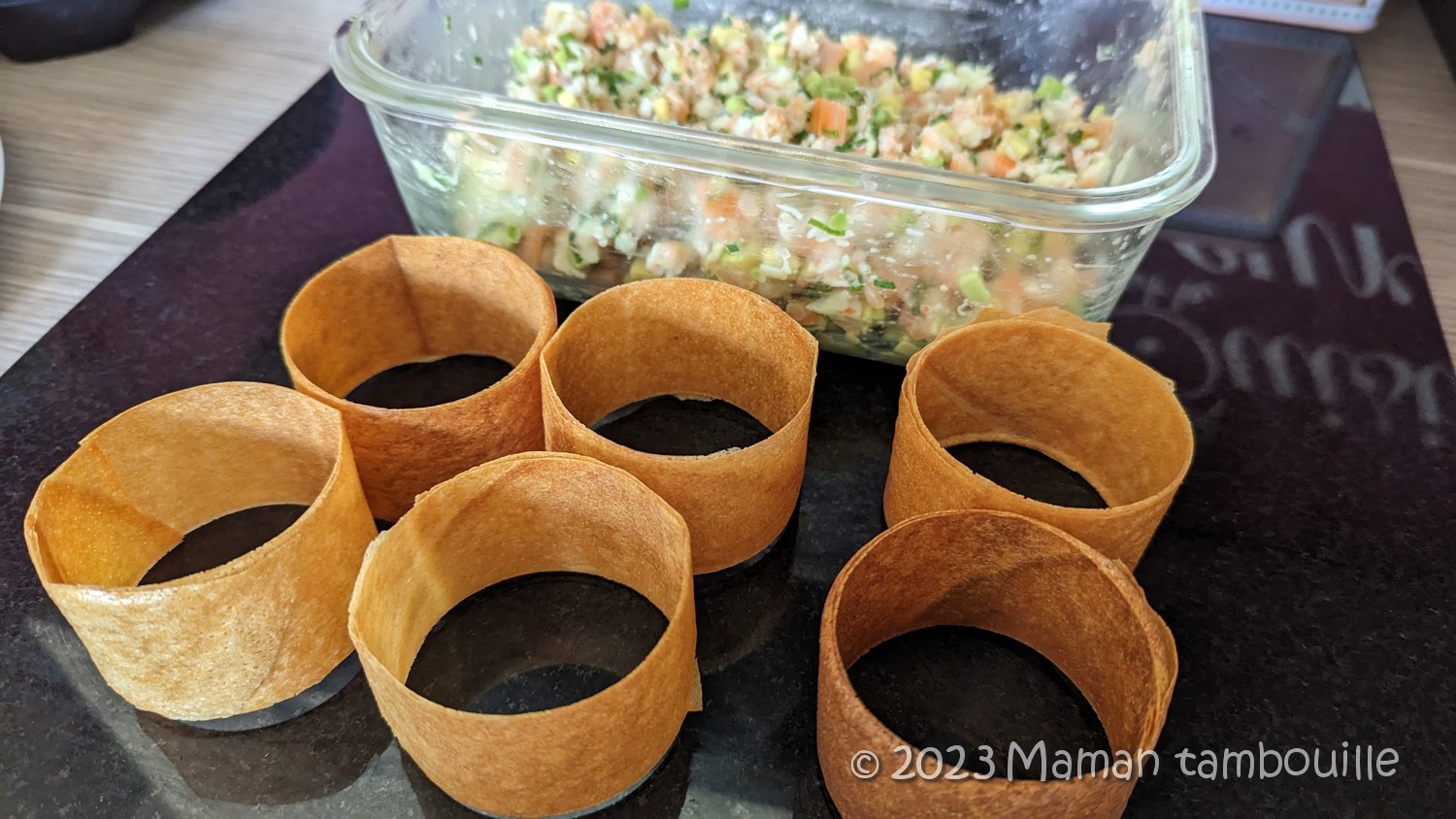 Préparer les cercles de bricks. J’ai utilisé la technique trouvée ici: http://lesotlylaisse.over-blog.com/article-realiser-des-cercles-de-feuille-de-brick-en-images-112197910.html