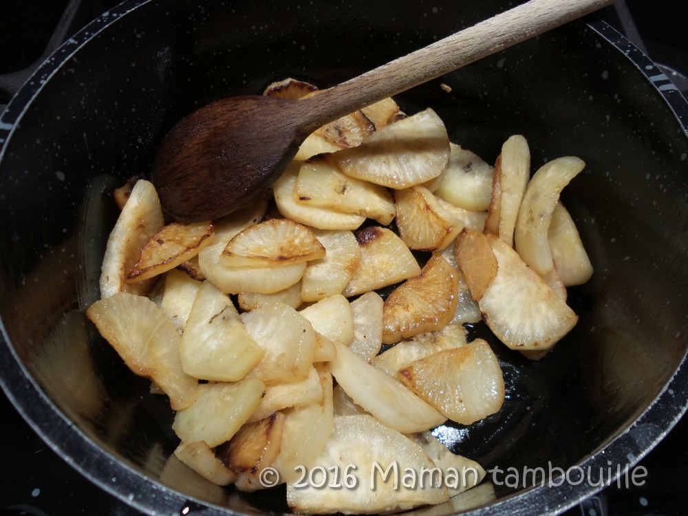 Faire chauffer du beurre dans une poêle et y faire cuire le radis noir avec un peu de sel. Il doit dorer mais rester croquant.