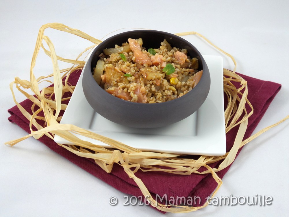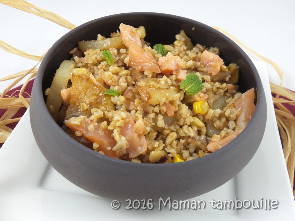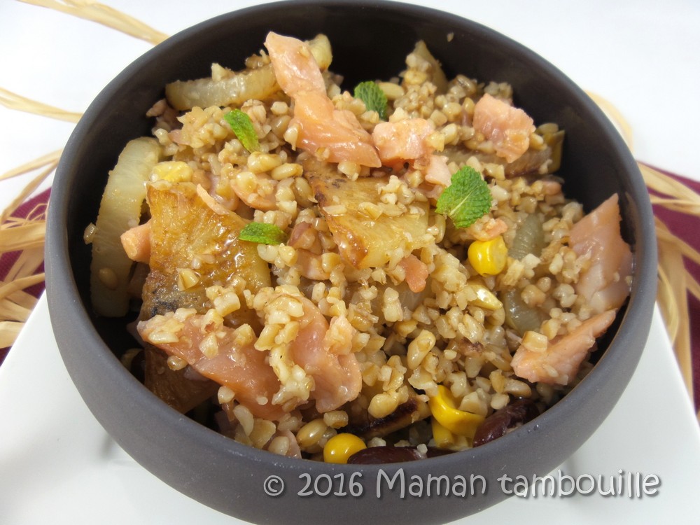 Un petit plat improvisé avec un sachet de céréales cuites, du radis noir sauté et des lardons de saumon fumé, le tout avec une vinaigrette au miel, balsamique et huile de sésame. J’ai bien aimé cette petite assiette à déguster aussi bien chaude que froide.