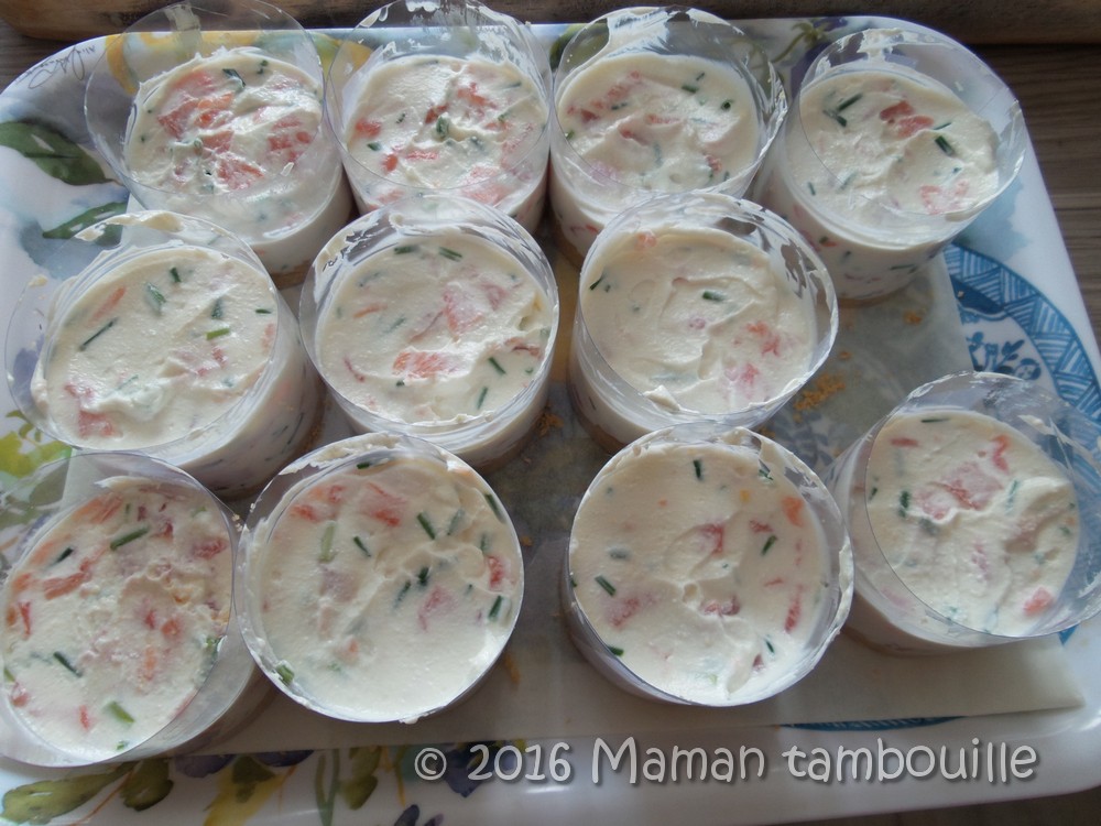 Couper le saumon en petits morceaux (en garder quelques petites lamelles pour déposer sur les cheesecake à la fin).