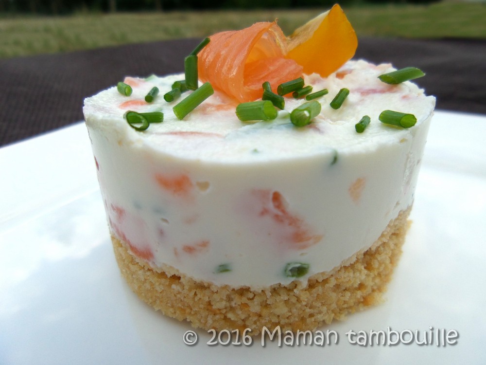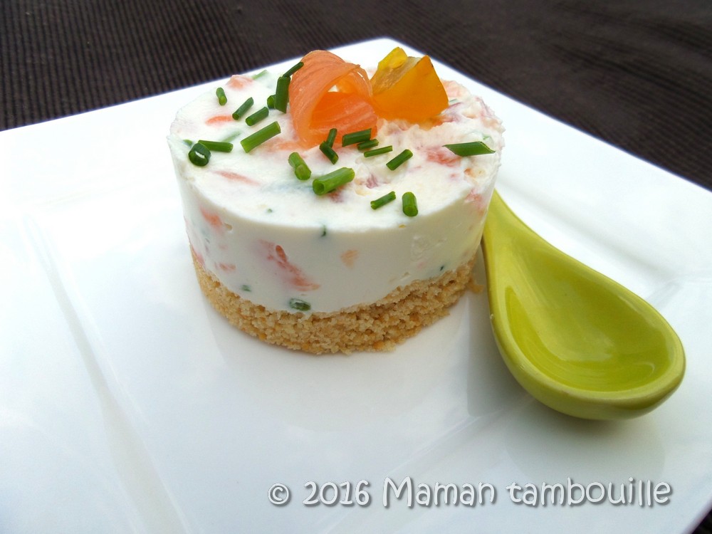 Je vous propose aujourd’hui une petite entrée tout en fraîcheur et qui présente joliment dans une assiette: un cheesecake salé au saumon fumé.