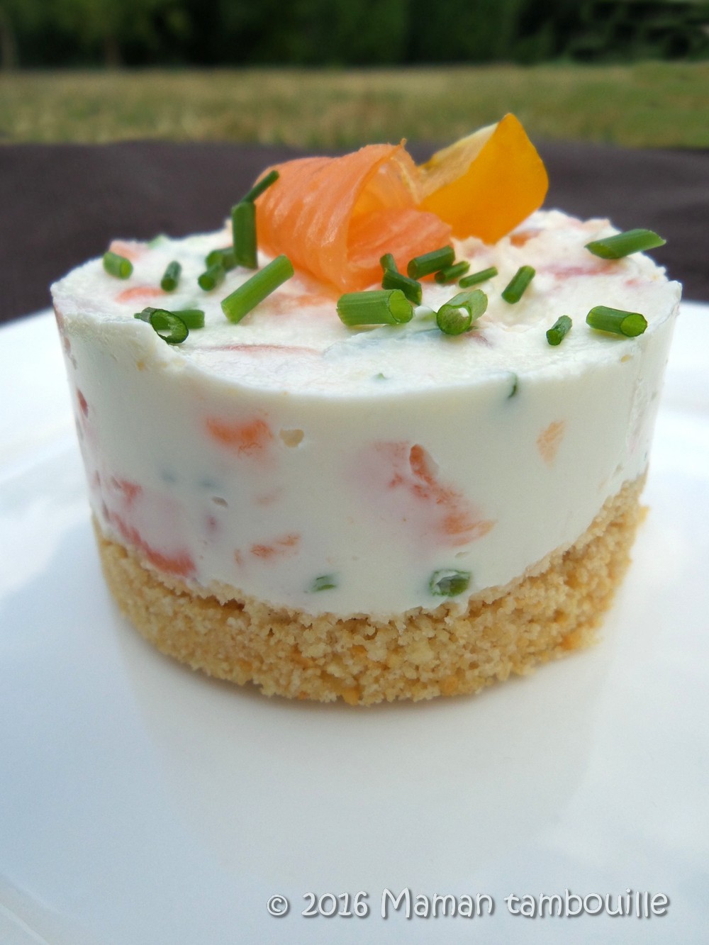 Servir bien frais et décorer d’une lamelle de saumon et ciboulette fraîche.