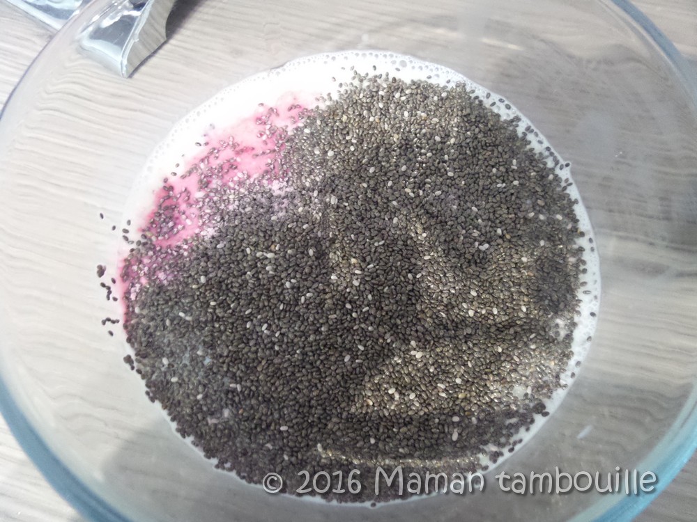 Dans un saladier, mettre tous les ingrédients et mélanger. Couvrir et réserver au frigo 24h le temps que les graines de chia gonflent. Mélanger de temps en temps.