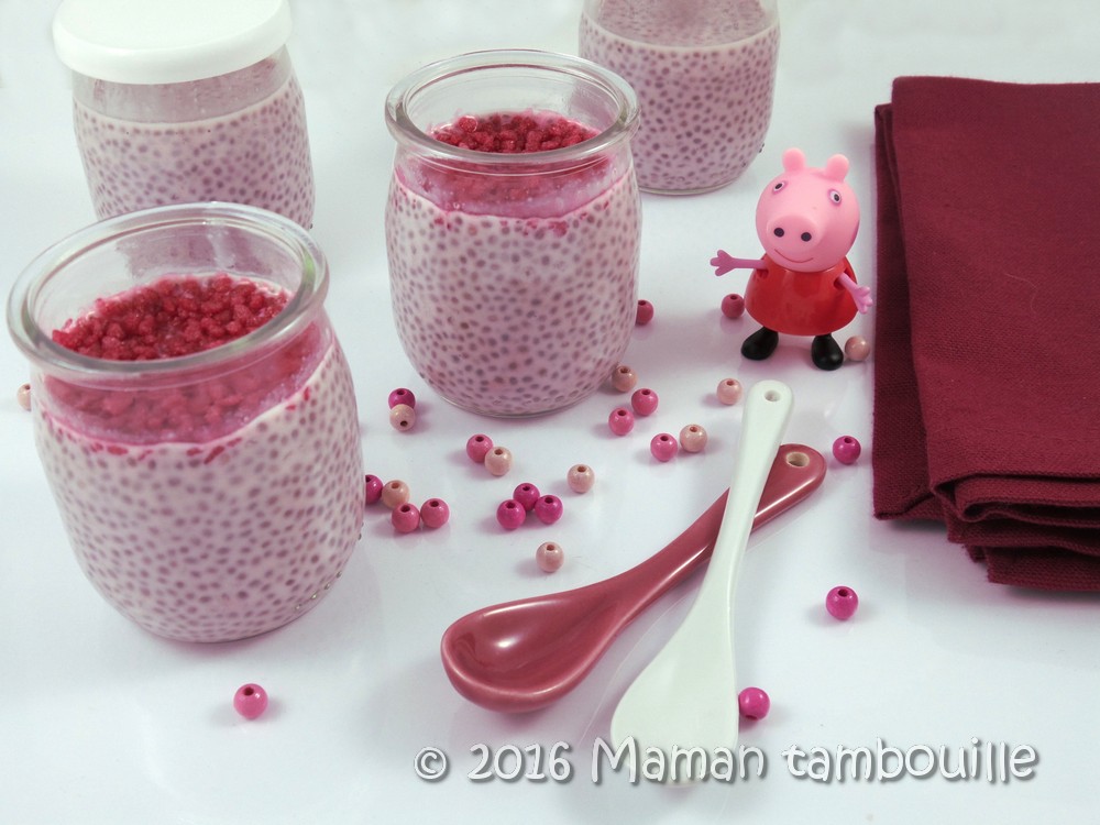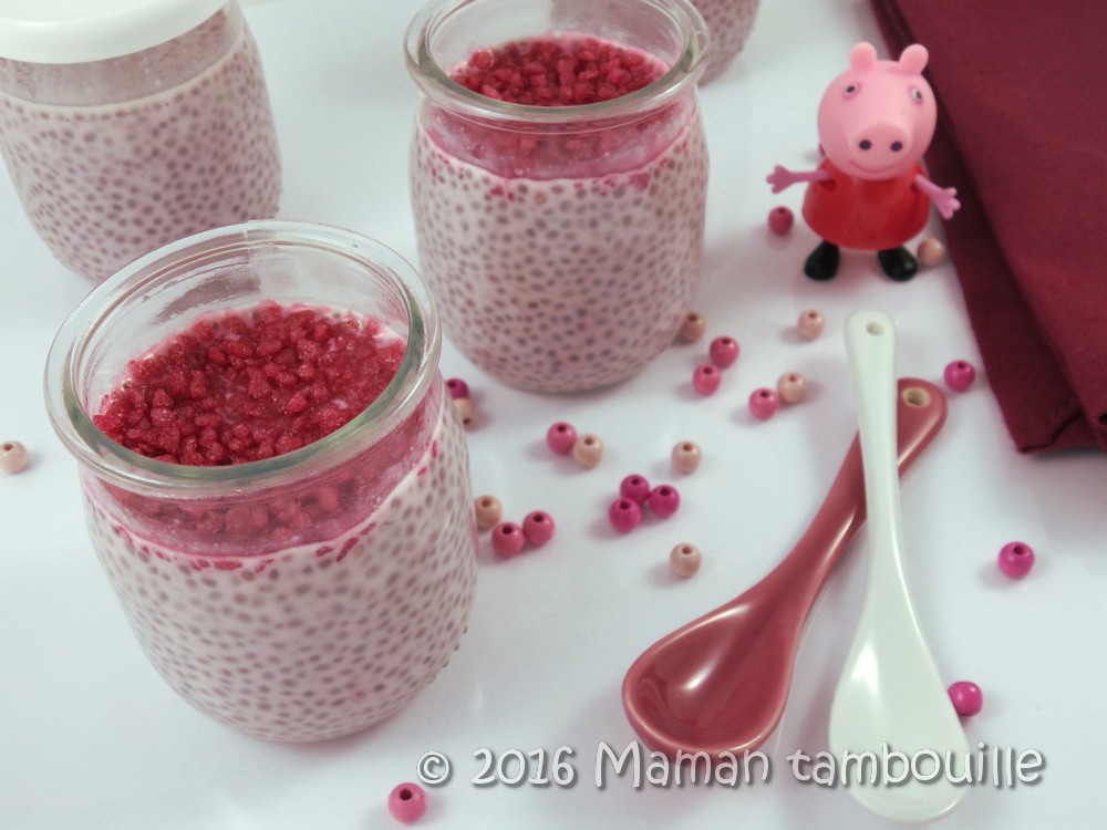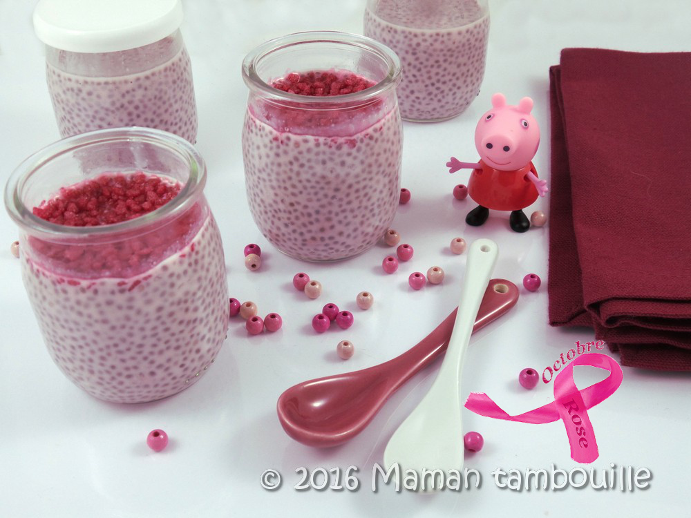 Bref, pour ce mois d’octobre rose, j’ai préparé des chia pudding tout rose au goût rose/framboise, un bon petit dessert qui change un peu !