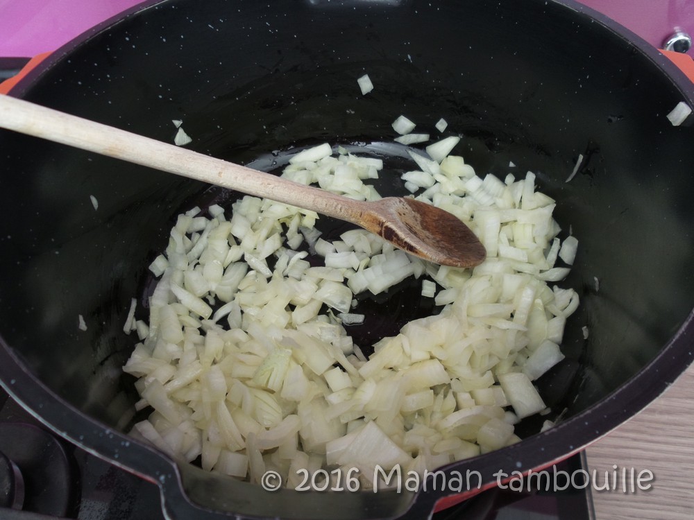 Pendant ce temps, émincer les oignons et les faire revenir dans une cocotte avec de l’huile d’olive.