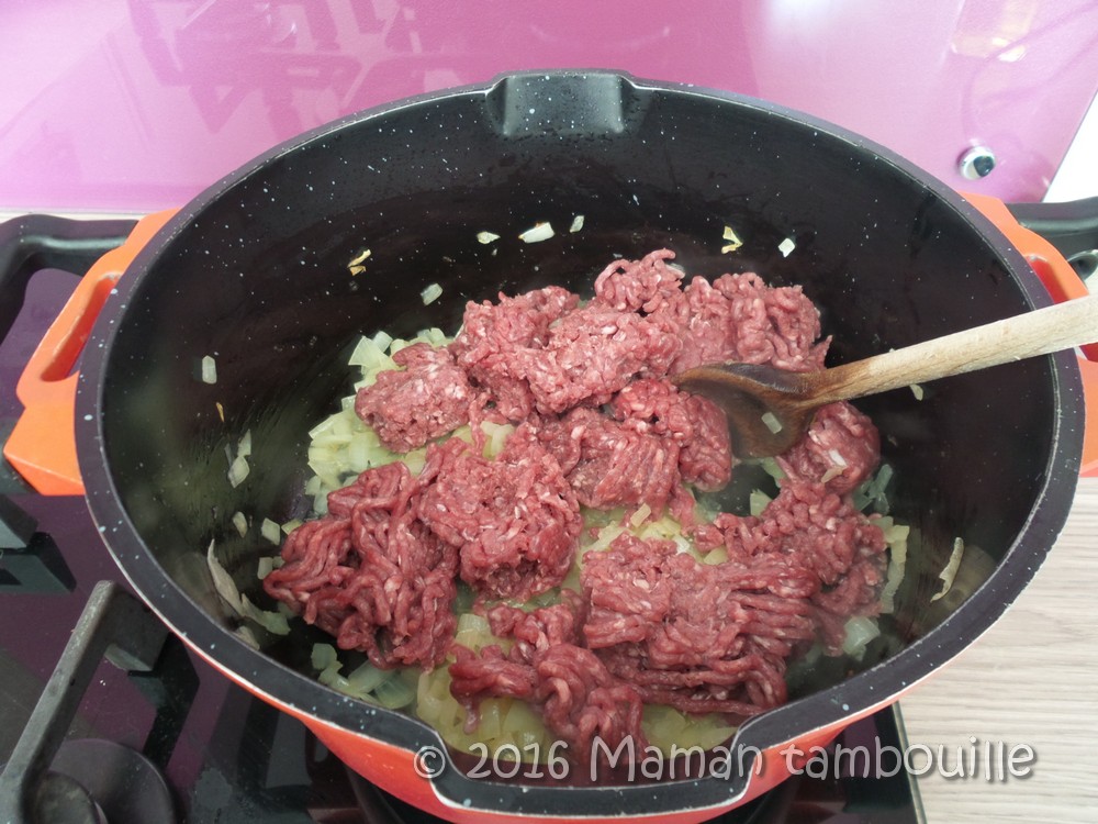 Je fais fondre les oignons et les réservent,puis je fais revenir la viande qui va rejeter forcément un peu de jus,et quand celle ci s asseche,j ajoute les oignons et le reste des ingrédients.je trouve qu’ ainsi les oignons ne prennent pas la saveur de la viande.