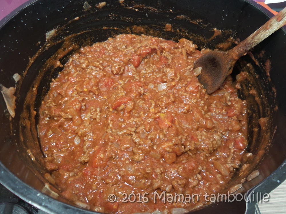 Ajouter la boite de tomate, le sachet d’épices et 1 verre d’eau.